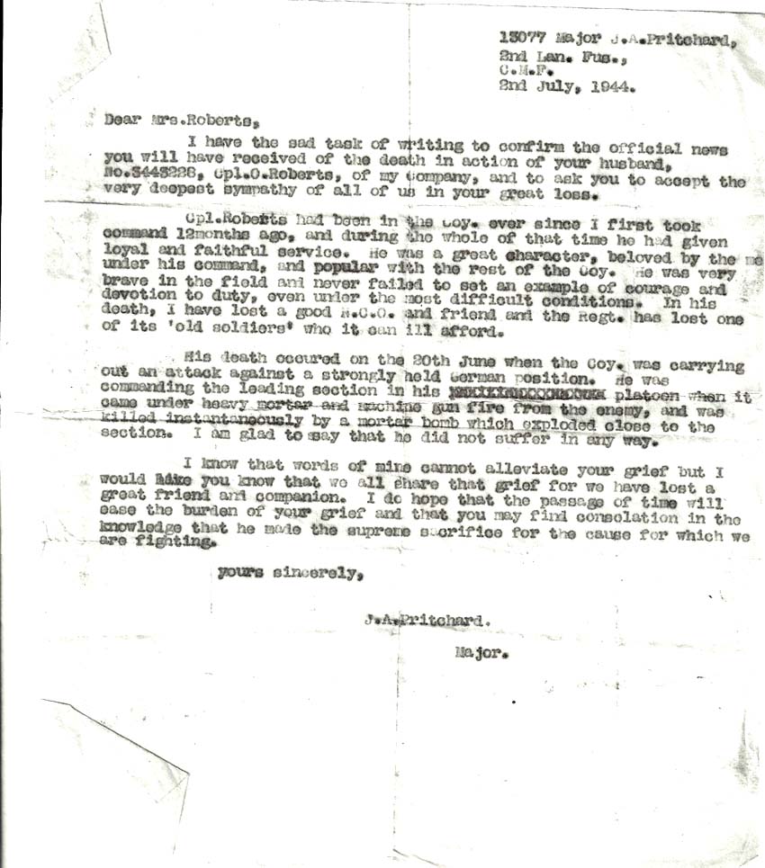 of ![]() 3443228 Cpl Oswold Roberts 2nd Bn Lancashire Fusiliers Killed in Italy 1944 at Lake Trasimeno |