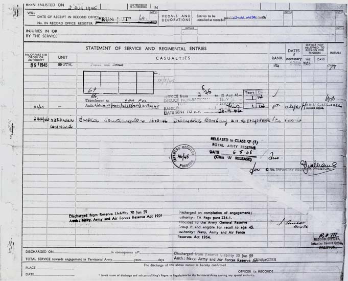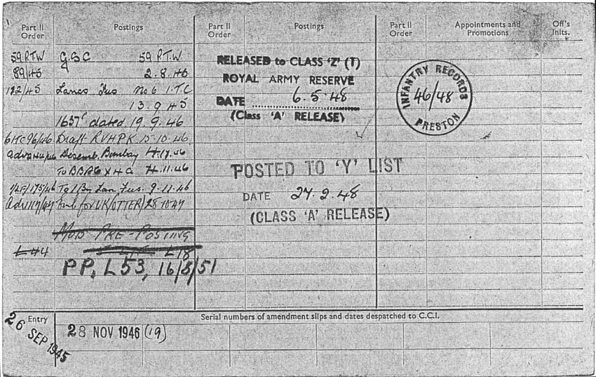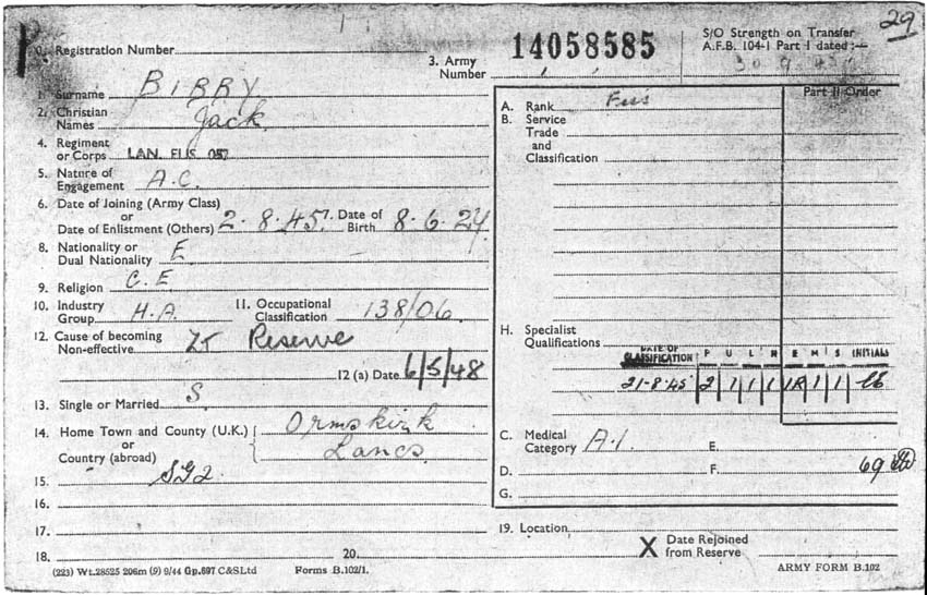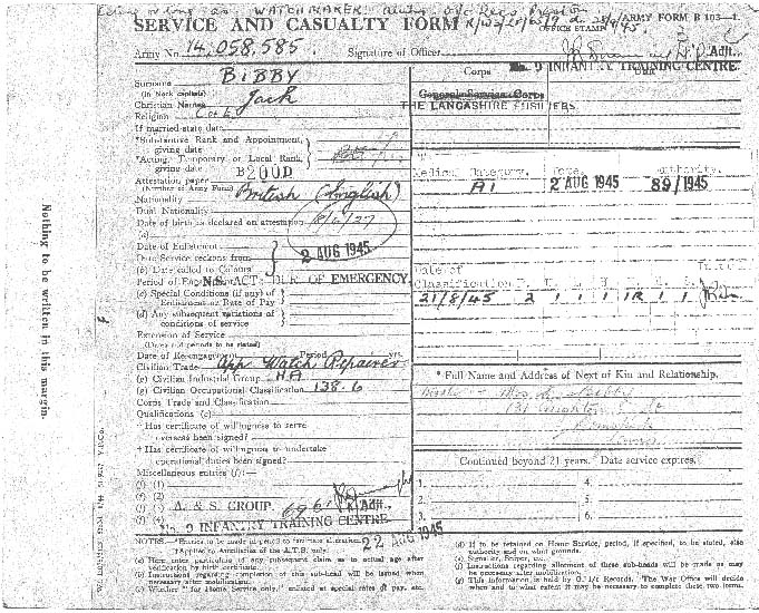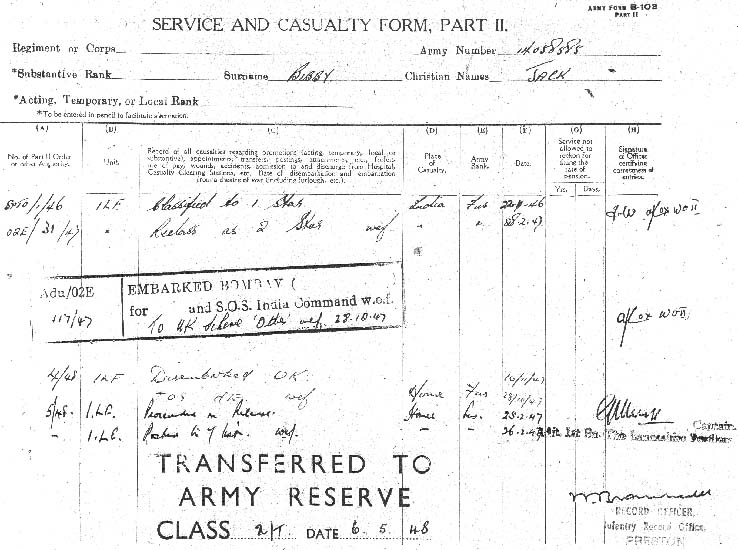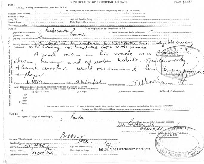 The following information might be of interest and it would be wonderful to find out more details of my father's service in the Lancashire Fusiliers. As is always the case, my father did tell me some stories of his army days, but I did not interview him enough, and now it is too late: he passed away on 2nd March 2009. And as I have lived and worked in southern Germany for the last 29 years, I have not had as much opportunity as I would have liked over the years to meet and talk with him. The facts as I know them are as follows - though some of the dates may be inaccurate: Jack Bibby was born on 8th June 1927 in Ormskirk, Lancashire and was an apprentice watchmaker when he was called up. The call up date was 2nd August 1945 and his Army Number was 14058585. His basic training took place from 22nd August 1945 in Berwick upon Tweed, as far as I know (Unit 59 PTW ?) and he was transferred to the Lancashire Fusiliers on 13th September 1945. He embarked in Southampton on 16th October 1946 and disembarked in Bombay 04th November 1946 (Unit: 02E India Command). He was located at 1st Lancashire Fusiliers on Indian Census of 30th November 1946. His unit was based mostly in Lucknow and (later I think) Ranikhet. The Fusiliers duties as he recalled them were "internal security"; guarding British and Indian establishments - stores, arms dumps and key installations such as water works, stations and government buildings in and around Lucknow city. He was, he told me, a Bren gunner and signaler. He became a one star fusilier on 22nd November 1946 and a two star fusilier on 28th March 1947. Returning to the UK, his unit embarked in Bombay on 28th October 1947 and disembarked in the UK (presumably Southampton) on 16th November 1947. He then spent his time waiting to be demobbed at Wem in Shropshire. He told me that the locals didn't really know what to make of the unit when the marched through the town - heavily tanned, with hackles in their "chapatti hats" and tropical khakis. He also told story about illicit Friday night bus trips from Wem to Liverpool, from where he continued on to Ormskirk for the weekend, the bus returning to Wem on Sunday evening. He told me that they once thought they had been "found out" when a young officer enquired about these "goings on". In the end it turned out that he just wanted to use the bus too! I wonder if someone might be able to corroborate the bus? Jack was released to Class 'Z' Royal Army Reserve on 06th May 1948 and discharged from the Reserve on 30th June 1959. I have recognised some of the motifs I know from my father's time in India on the Homepage. My father told stories about "flag marches", though he said that they "didn't survive long" after his arrival in Lucknow. Sergeant Major "Kitna" Price was also subject of some of his stories. Whether from hearsay or personal experience I cannot say). He seems to have been just as much in awe of him as everybody else - though I cannot remember the exact stories he told about him. I do remember telling me though about something (slightly coarsely) called "the barrow load of virgins patrol", which seems to have consisted of escorting a "cart full of Maharaja's daughters" from A to B - though I have no notion of the geographical place nor what institution A or B might have been. I do know though that he enjoyed it! For one thing because on that patrol he didn't have to carry the Bren gun and was allowed to strap a "great big revolver" to his webbing belt - at least that is what he told me. My father told me about Indian Officers with the "Kings Commission" who had to be treated like British officers and seemed to have been particularly fond of a "Sikh major much better educated than me - a good leader" I wonder who he was? He also told of an Indian medical officer, "a very respected man". My father's favorite memories were of the patrols (out of Ranikhet I presume) into the "northern hill country", visiting remote villages usually as escorts for Indian police officers. He described that time as "great days in magnificent, quite awe-inspiring scenery - away from the heat of the plains." Another, quite personal and rather funny story he told was of a nameless big, street wise Liverpudlian who desperately wanted to get into the Army but couldn't pass water at the military physical, so Jack, helpful and friendly as always, did it for him. Sometime later, in India I presume, they met again - perhaps the nameless Scouser was seconded to the Fusiliers(?) I don't know. Still, when the big Liverpudlian, who obviously, on the strength and health of Jack's water, had successfully enlisted, recognized Jack he loudly declared "See this fellah here? He pissed for me! He's my friend!" So in the following period Jack had a faithful friend who would always stand by him and get him out of a scrape. Once again I don't know the exact truth content of the story. The beginning of it, at the military physical, is probably impossible to corroborate! But I do wonder if anyone recognizes the big Liverpudlian? Those are the facts and stories as I know them. Any information to fill in the blanks would be very much appreciated.