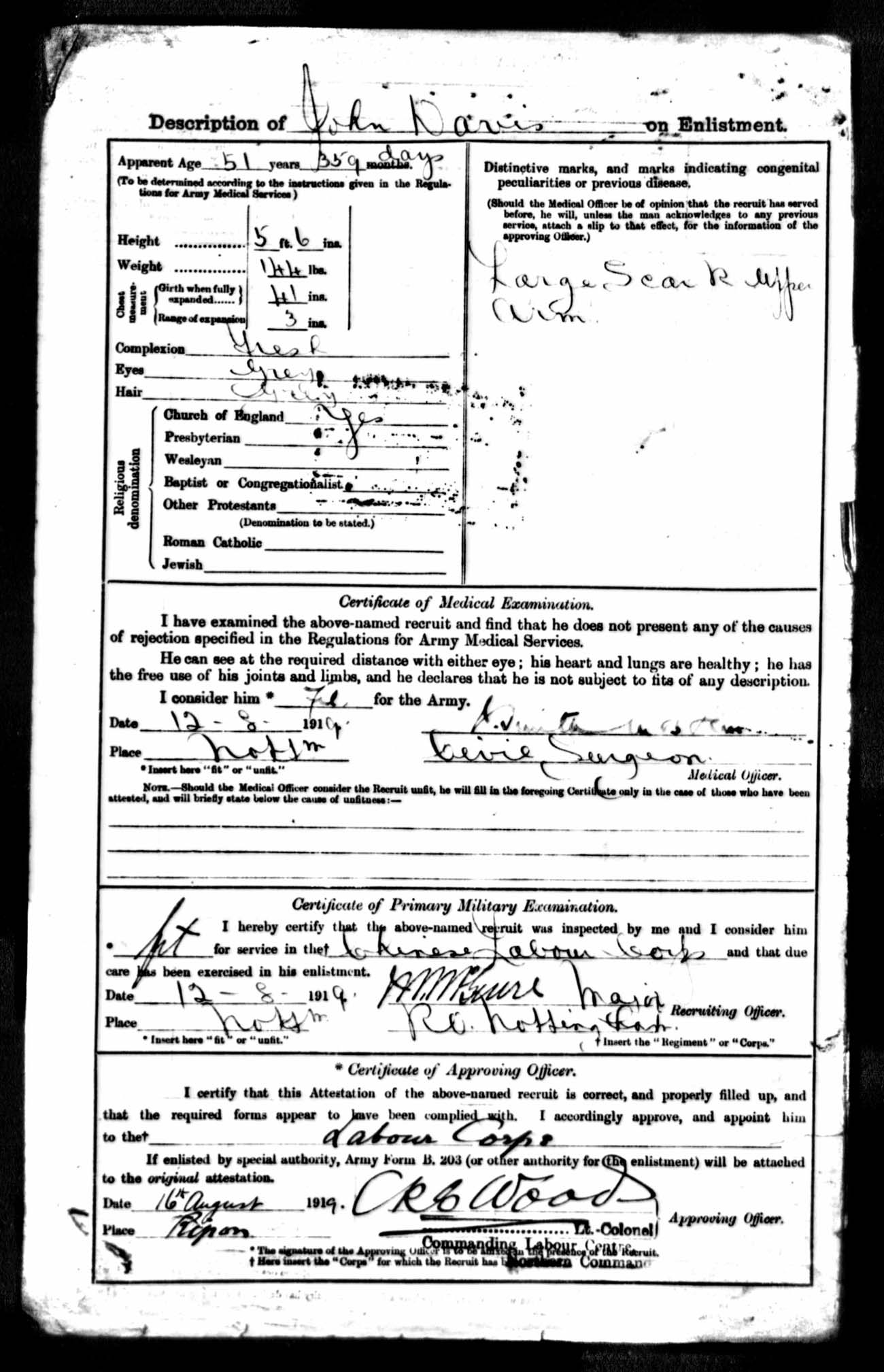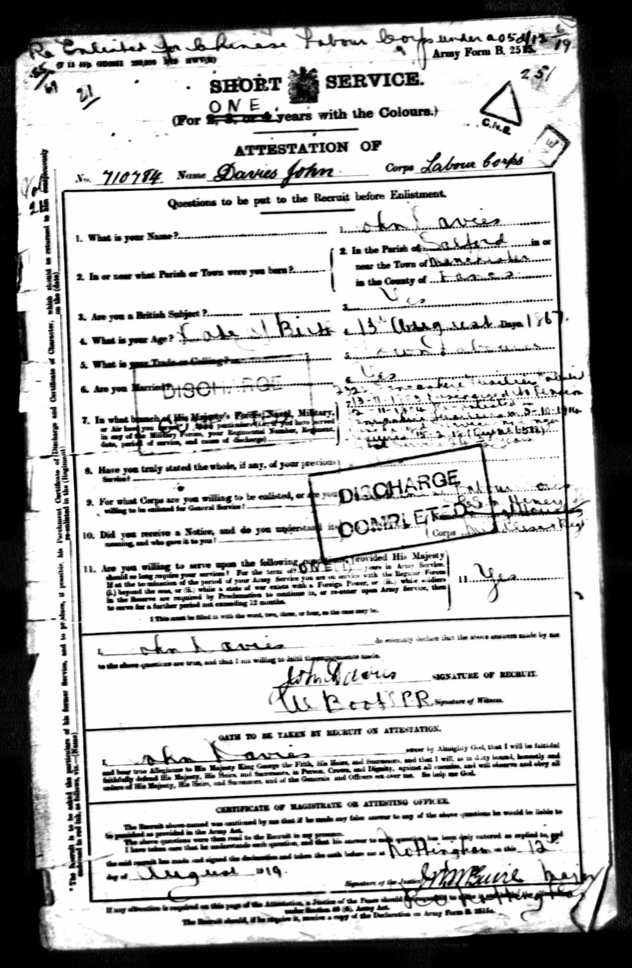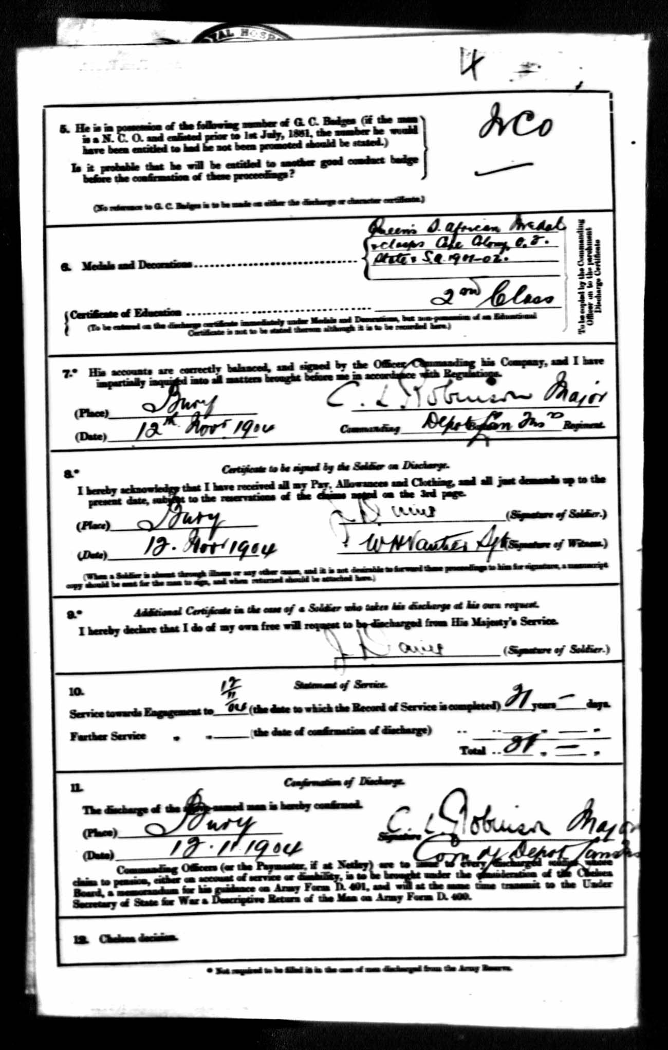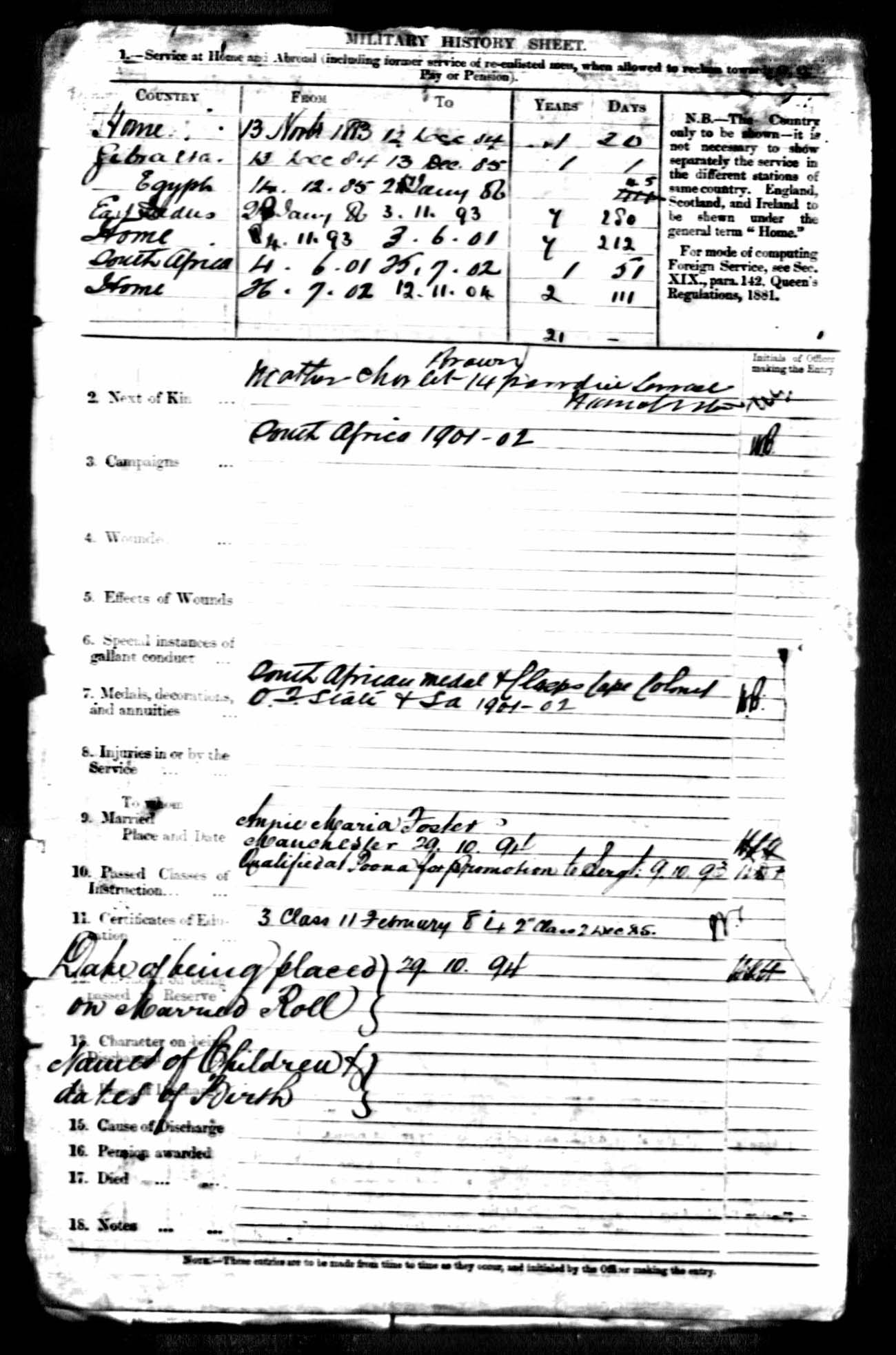 He is known to have been a PS instructor with the 5th Bn when he fought at Spion Kop in the Boer War. Having ended his engagement, he re-enlisted in the LFs for WW1 and was discharged in 1918 with the rank of Comany Sergeant Major, only to re-enlist in the Chinese Labour Corp where he served until 1919. Sent in by his grandaughter Louise Fitzpatrick Myaree, Western Australia. |