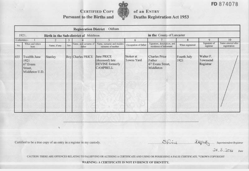 He became the Project Liaison Officer given the task of setting up the new Fusilier Brigade Depot at Sutton Coldfield and between 1961 and 1963 he supervised the building and equipping of St George's Barracks. 1963 to 1970 saw him in Kenya again as QM to the Army Civil Defence School at Kahawa until his promotion to Lt Col. Lt Col Stanley Price then went to the Army Staff as Staff QM MOD AG2 and served there until he retired from active service in 1975,having given a total of 36 years,and having been awarded the OBE in 1974. He had not finished! He took a Retired Officer Post at HQ The Prince of Wales Division and then he was off to the Sultan Of Oman's Armed Forces with the responsibility of equiping the Sultan's Armed Forces. He was home on leave when following a sudden and very short illness he died. |