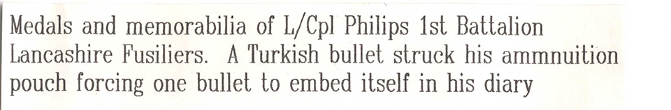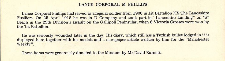 Back of the above post card Diary extract, Gallipoli L/Cpl M Phillips account of action at Gallipoli, 1915
