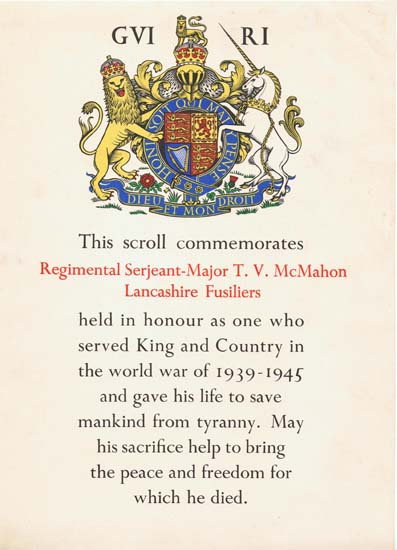 Rank: Warrant Officer Regiment/Service: Lancashire Fusiliers Secondary Regiment: Nigeria Regiment, R.W.A.F.F. Age: 31 Date of Death: 08/07/1941 Service No: Additional information: Son of Patrick and Mary McMahon; husband of Mabel McMahon, of Cotehill, Cumberland. Casualty Type: Commonwealth War Dead Grave/Memorial Reference: European Sec. Grave 24. Cemetery: ENUGU TOWNSHIP CEMETERY http://www.cwgc.org/search/casualty_details.aspx?casualty=2383818 |