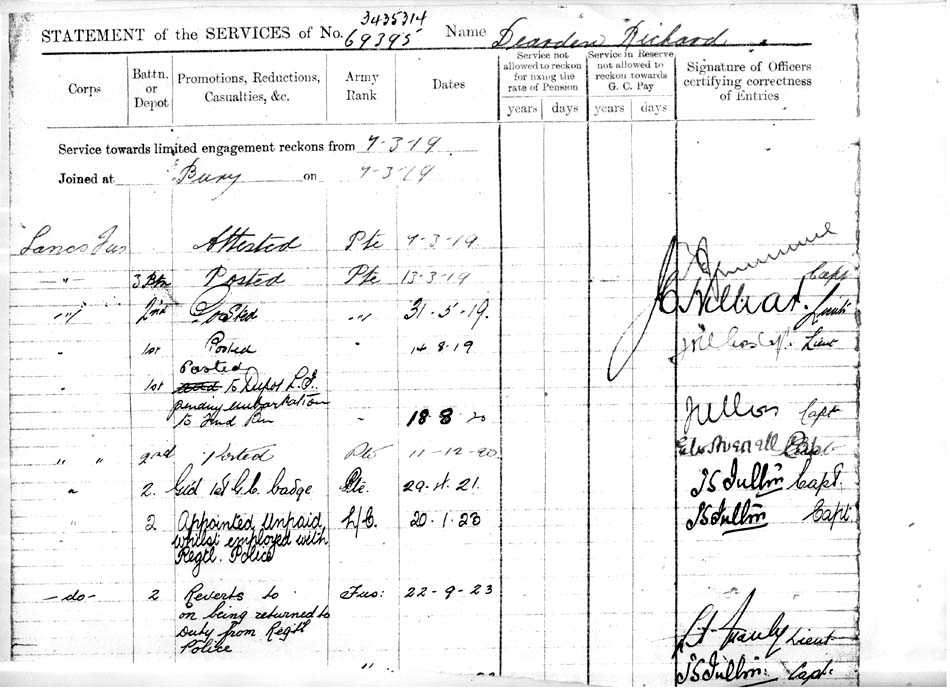 He enlisted into the 2nd Battalion the XX Lancashire Fusiliers in 1919.