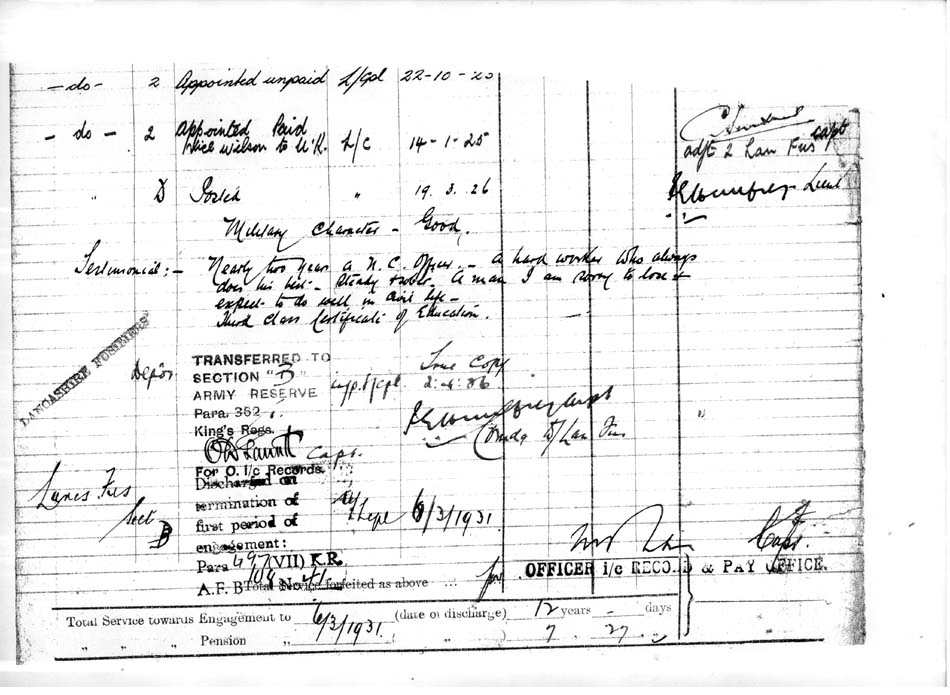 In 1926 he was returned to the UK at the end of his 7 years service and