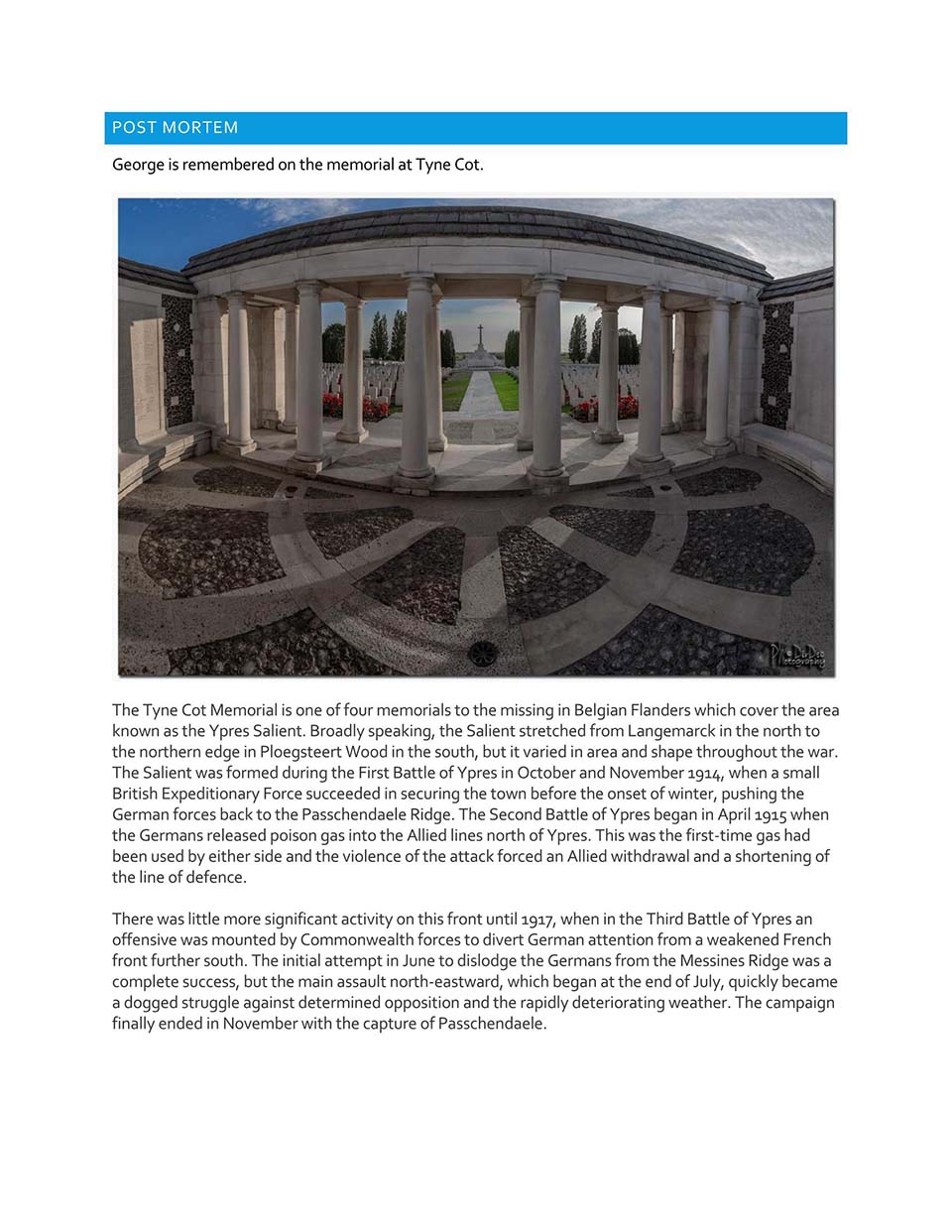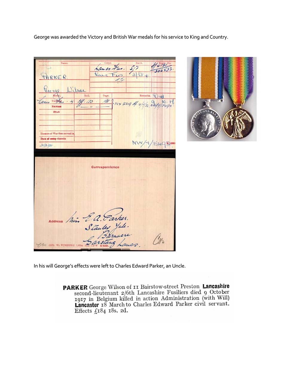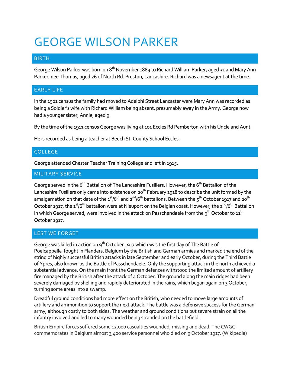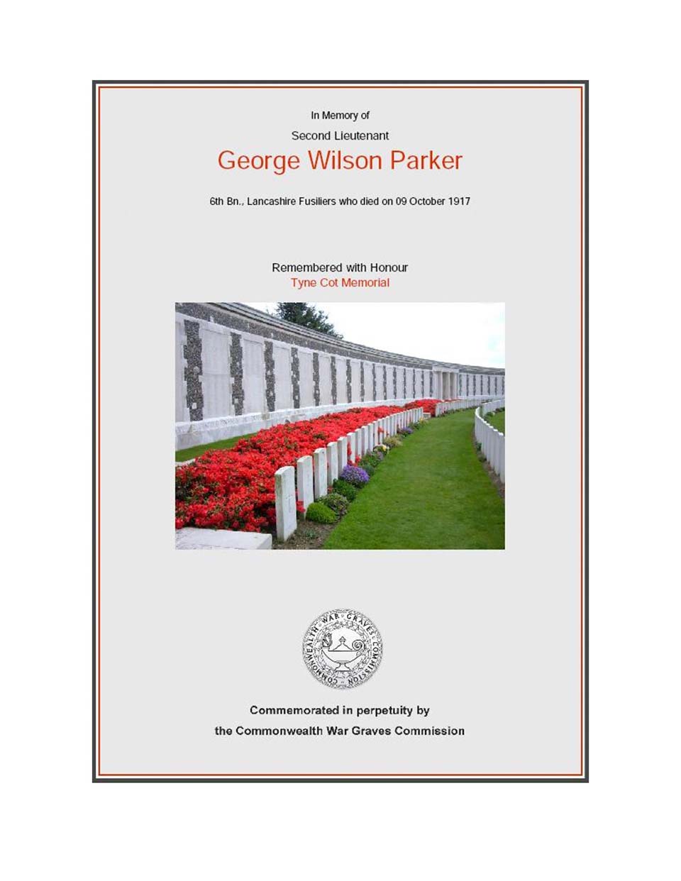 The feature Page of 2Lt George Wilson Parker 2nd /6th Lancashire Fusiliers Who was killed on the 1st day of the Battle of Passchendaele. Thank to Steve Parker for his work on this feature