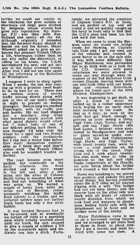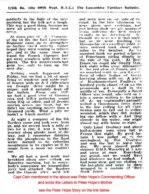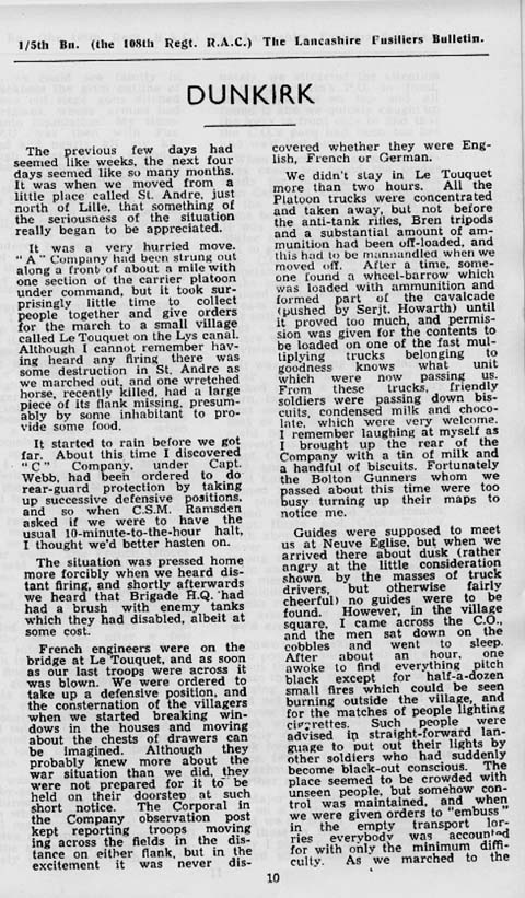along with 1/6th LF and 1/8th LF. This is a short account of the move to the Dunkirk beaches and the role the 1/5th LF played in the withdrawal. The account is taken from a report by Captain Michael Westmore LF and researched/adapted by Joe Eastwood." |
