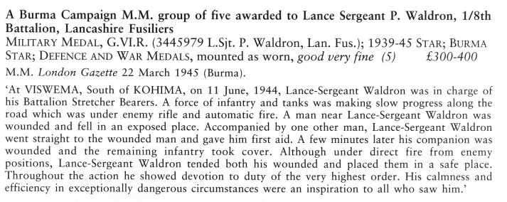 Name Date Medal / Awards L/Sgt P Waldron 11th July 1944 Military Medal. 1939-45 Star Burma Star Defence and War Medal