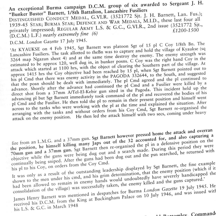 Name Date Medal / Awards James Henry Barnett (Bunker Buster) 17th July 1945 D.C.M.:1939-45 Star: Burma Star:Defence and War Medals and "Mention in Dispatches"