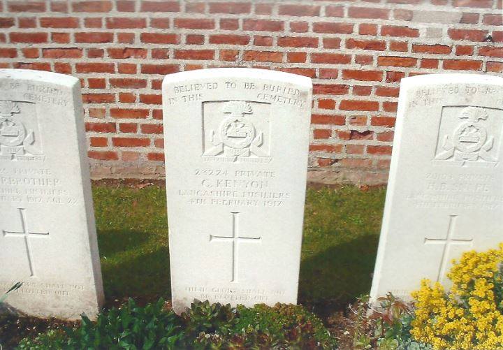 Private George Kenyon 10th Lancashire Fusiliers. Private George Kenyon, of the Lancashire Fusiliers, was killed in action in France, on February 4th, 1917. He resided at 9, Manchester New Road, Middleton, and joined the colours in August, 1915, going to France on February 4th, 1916. He was killed exactly 12 months to the day from landing in France. He was only 19 years of age, and left a widow and one child. Prior to enlisting he worked at the Irk Mill and was an enthusiastic footballer, having played with Newtown. Private Kenyon is believed