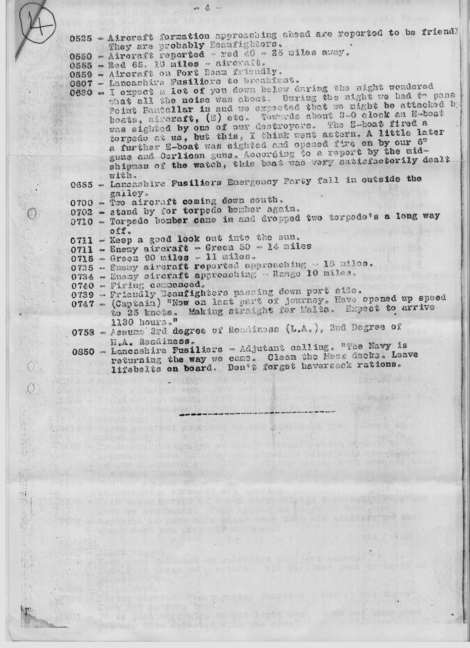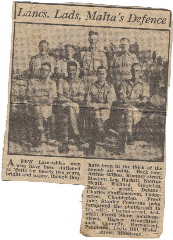 Lancashire Fusiliers January/February 1941 at Cruden Bay in Scotland building beach defences, attached to the Royal Engineers. May/June 1941 at Nitshill In Glasgow kitting out for middle east. Five days embarkation leave prior to sailing in June 1941. During the third week of June 1941 sailed from Gurrock on the River Clyde to an unknown destination - Code "Z". Spent seven days at sea with the Atlantic convoy on board the "Louis Pasteur", a 36,000 ton French liner. After seven days arrived in Gibraltar at noon on Saturday. Lancashire Fusiliers had six hours to disembark and re-embark with all battalion stores and weapons onto HMS Edinburgh. Sailed at 6.00 p.m. Saturday back into the Atlantic convoy of naval craft, tankers and supply ships. After dark, sailed through the Straights of Gibraltar into the Mediterranean with full naval escort. Sunday morning spotted by Italian planes and for four days were continually attacked by Italian and German planes, e-boats and submarines until Thursday morning. Arrived in Malta late afternoon, still under air attach. Endured the Battle of Malta for nearly three years from July 1941 to March 1944. Then embarked for Italy for the Italian campaign up to V E Day on 8 May 1945. First British Division attached to American 5th Army. Front line combat in Cassino, Rome, Apennines, Arrezzo, Florence to the Gothic Line. Hard bitter fighting. Relieved to have four weeks Leave in Anticipation of Python (five years service) to UK in January 1945. Returned to Italy in February 1945 after cook's tour of middle east. Try to catch up to Battalion who had been pulled out and sent up to the Persian border (Iran). We arrived at Infantry Reinforcement Training Depot at Biano outside Naples at the base of Mount Vesuvias. Lava dust for breakfast, dinner and tea enjoyed with the stink of sulphur. From the IRTD to Rome to camp outside Rome as usual waiting for orders when V E day came - 8 May 1945! Handed all weapons in and returned to Naples. Embarked on "Stratheden" for final sail to UK. Arrived at Liverpool and entrained to Hunstanton, the Lancashire Fusiliers holding depot. After one month's leave returned to Hunstanton and sent to Sandringham House in the Queen's Estate - known as BAX force, general duties and guards. Sent up to Morpeth in Northumberland on NCOs course and made up to Sergeant. Sent with Sergeant Dom Browskie to Launceston in Cornwall to fall camp and guard duties for German repatriated prisoners of war coming from America and Canada. Once in the camps all prisoners were graded, searched and sent back to Germany. From here Sergeant Leslie Hill was demobbed in June 1946 sent in by