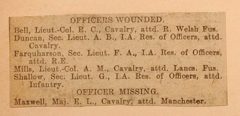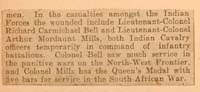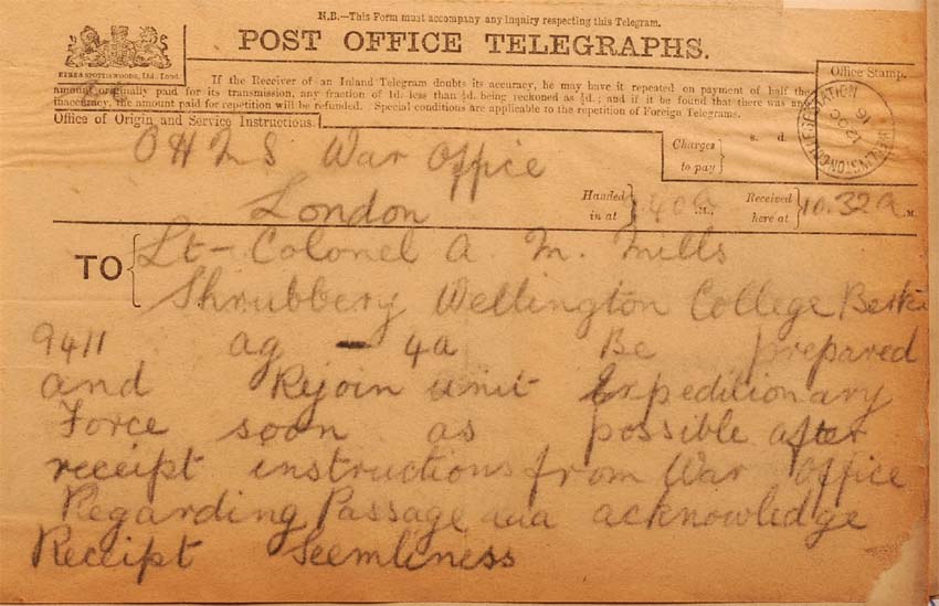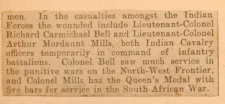 Major-General Sir Arthur Mordaunt Mills, C.B., D.S.O ( with 2 bars and Mentioned in Dispatches 3 times) Arthur was born on 13 August 1879, the son of Colonel Arthur McLeod Mills and Elizabeth Louisa Jane Pughe, at Hythe, Kent. He joined 3 Royal Sussex Regt (Militia) 1900; transferred to 1 Bn, Devonshire Regt 1901; South African War 1901-1902; transferred to 18 Bengal Lancers, Indian Army 1902; Adjutant & Quartermaster, Staff College, Quetta 1913-1914; World War I 1914-1918; Staff Capt, France 1915; 14 Bn, Gloucestershire Regt 1915-1916; Commander, 17 Bn, Lancashire Fusiliers 1916-1917; Instructor, Senior Officers School, Woking 1921-1924; Commander, 2 Bn, 4 Prince of Wales' Own Gurkha Rifles 1925-1929; Assistant Adjutant General, Northern Command, India 1929-1930; Cdr, Razmak Brigade, Waziristan, North West Frontier, India 1930-1934; Aide-de-camp to the King 1933-1935; Military Adviser-in-Chief, Indian State Forces 1935-1939; retired 1939; Col, 4 Prince of Wales' Own Gurkha Rifles 1935-1950.