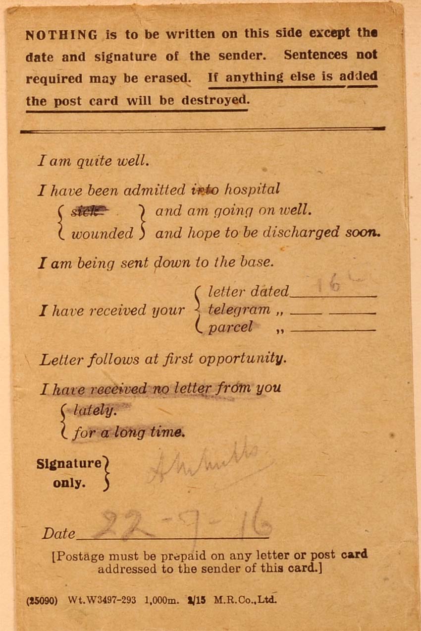 sent by Private (and later) L/CPL Henry John Hughes Number 14216