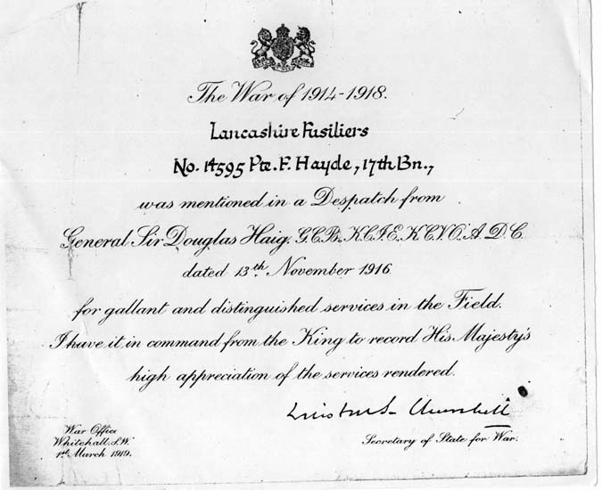 was a corporal in WW1 with the Lancashire Fusiliers. He was in D company