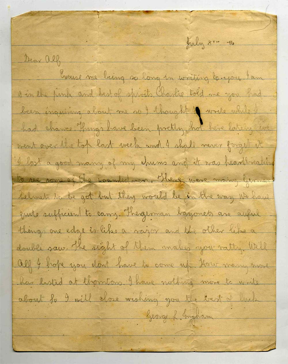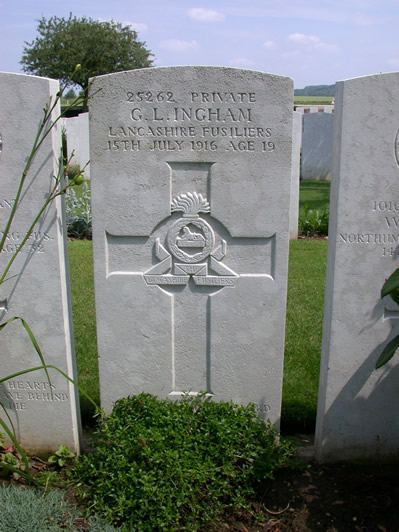 Initials: G L Nationality: United Kingdom Rank: Private Regiment/Service: Lancashire Fusiliers Unit Text: 19th Bn. Age: 19 Date of Death: 15/07/1916 Service No: 25262 Additional information: Son of George and Emma Ingham, of 58, Grouse St., Rochdale, Lancs. Casualty Type: Commonwealth War Dead Grave/Memorial Reference: III. E. 24. Cemetery: WARLOY-BAILLON COMMUNAL CEMETERY EXTENSION ![]() "Pte G L Ingham was killed in action just 7 days after posting this letter home." sent in by Colin Fraser Oakville, Ontario Canada. http://burnleygallantry.co.uk/ingham/inghamgl.htm http://3rdsalfords.blogspot.ca/2012/04/i-grew-up-knowing-that-my-maternal.html |