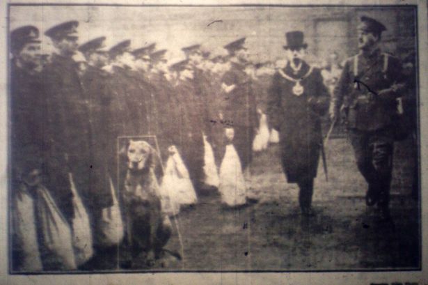 The Mayor of Salford (Alderman Worsley) inspecting the Salford Battalions of the Lancashire Fusiliers before their departure for Conway. Major-Godfrey, Chief Constable of Salford, seen on the right, the with the regimental mascot also pictured |