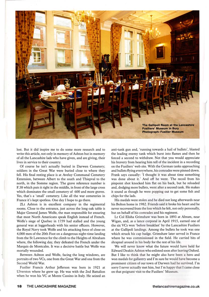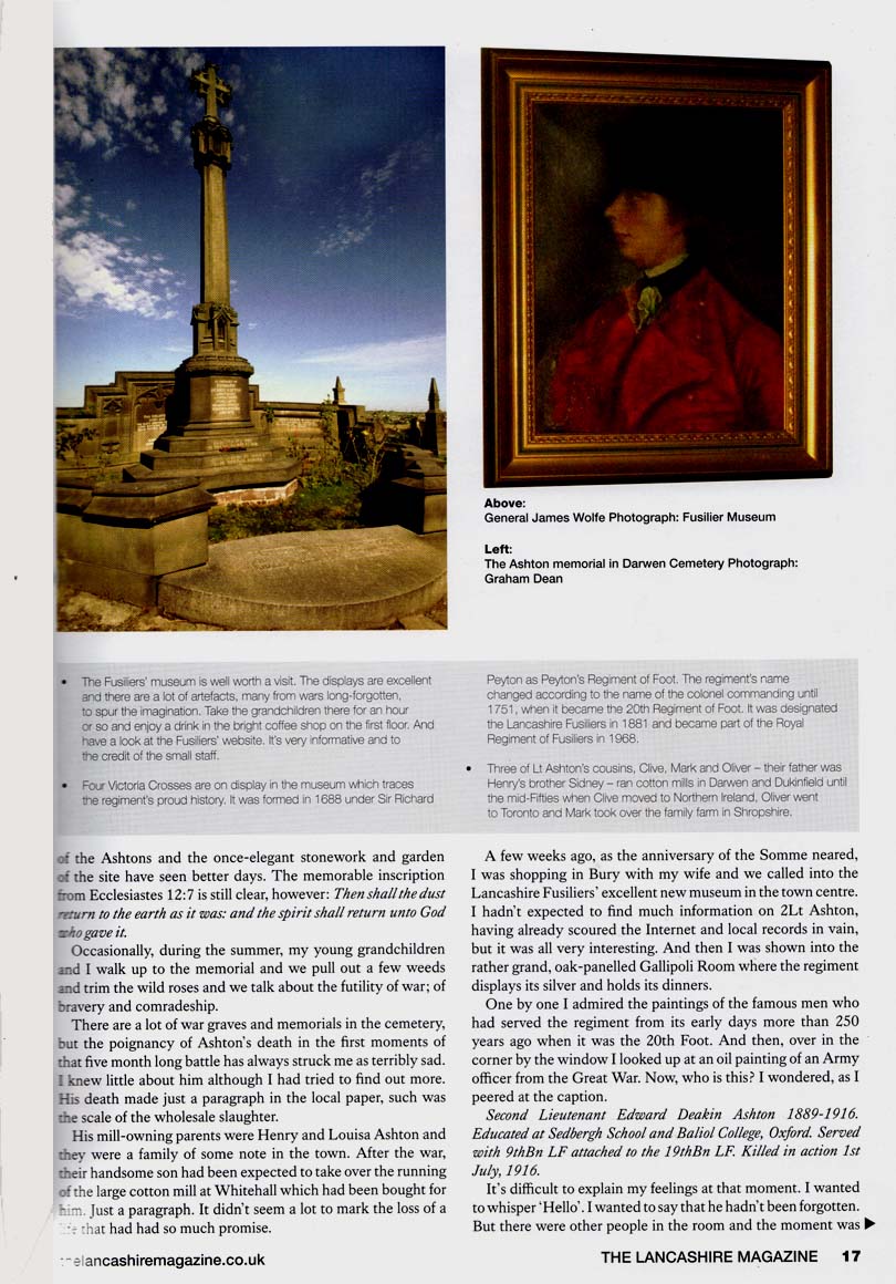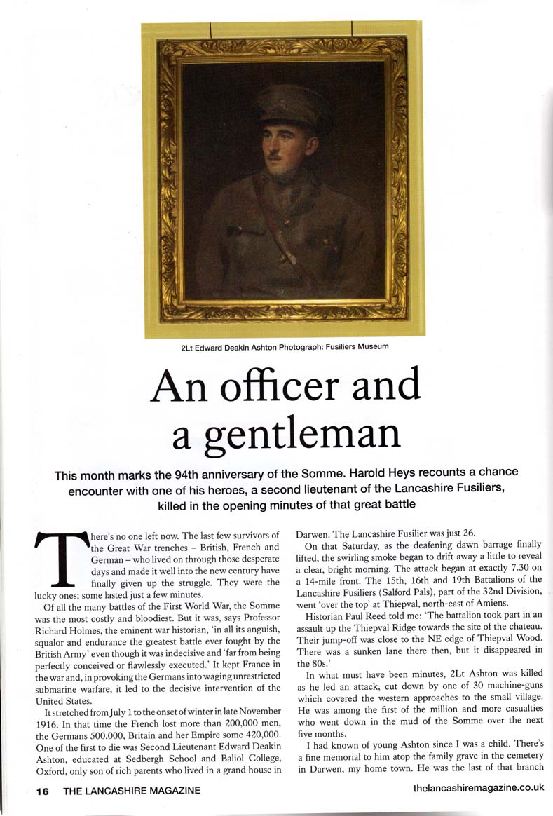 Name: ASHTON, EDWARD DEAKIN Nationality: United Kingdom Rank: Second Lieutenant Regiment/Service: Lancashire Fusiliers Unit Text: 9th Bn. attd. 19th Bn. Age: 27 Date of Death: 01/07/1916 Additional information: Son of H. D. and Louisa Ashton, of "Ellerslie," Darwen. Educated at Sedbergh School and Balliol College, Oxford. Casualty Type: Commonwealth War Dead Grave/Memorial Reference: F. 38. Cemetery: AVELUY COMMUNAL CEMETERY EXTENSION ![]() ![]() ![]() |