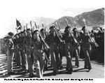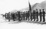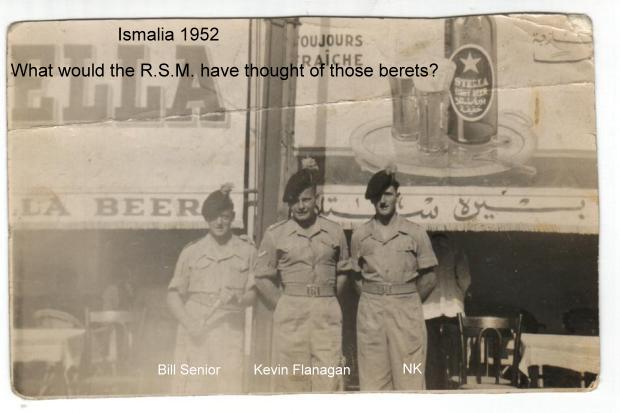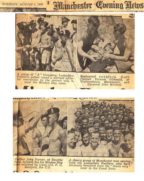 In July 1951, HMS Euryalus was sailing through the Suez Canal bound for Abadan to relieve HMS Mauritius. Euryalus stopped for a short time at El Ballah which enabled a large party including the band from the 1st Bn LFs to travel in trucks on the 12th July to visit her. During this time, The CO and the Captain discussed the possibility of a small party from the Bn reinforcing the Marines who were aboard at that time. A few days later permission had been granted and at 1130 hrs Wednesday the 19th July 1951 a composite group commanded by Major T P Shaw (OC A Company )flew in Hastings aircraft from Fayid to Bahrein. The party was 43 strong, including the whole of Number 3 Platoon A Coy commanded by 2nd Lt N H Leadsom. They landed at Bahrein Island at 1800 hrs the same day and went by lorry to the Naval Barracks where they stayed the night. The following day they marched to the jetty and boarded the Euryalus,sailing for Abadan at 1030 hrs the same day. The A Coy contingent were on board for Minden Day so the OC Major T P Shaw contacted the regimental contractor Shaab Din back in Egypt and ordered 100 roses for the Fusiliers to wear in their berets. Surprise, surprise when a bum boat approached the ship and was given permission to come alongside with roses for Major Shaw. He found himself to be the recipient of 100 bottles of Rose's Lime Juice which caused more than a few laughs that day. This event later featured in a Rose's Lime Juice advert.