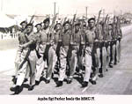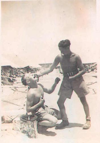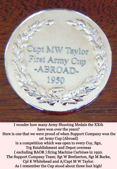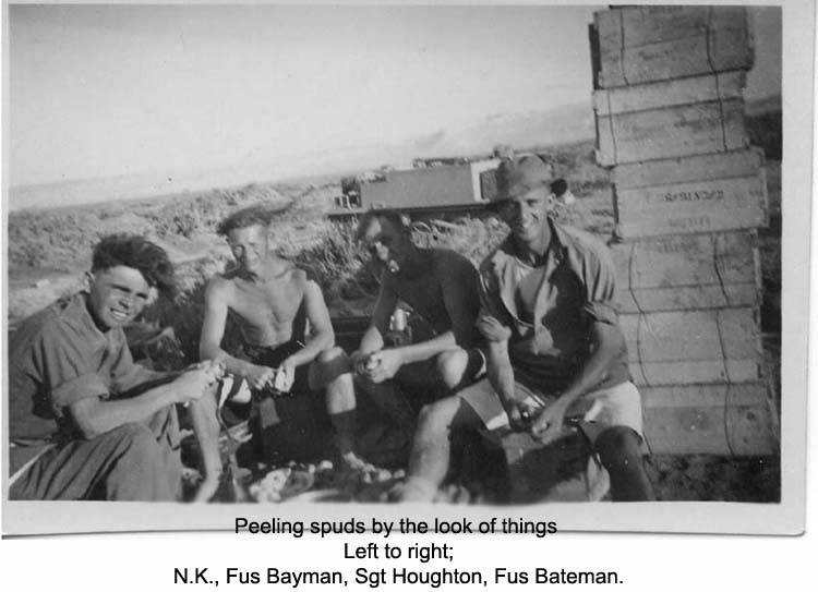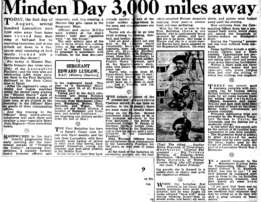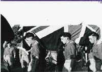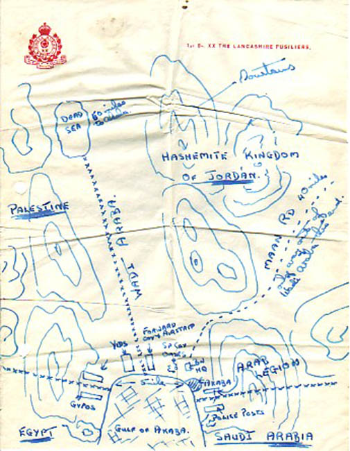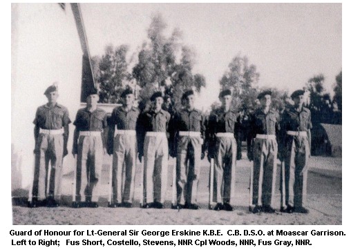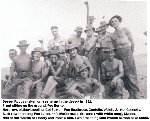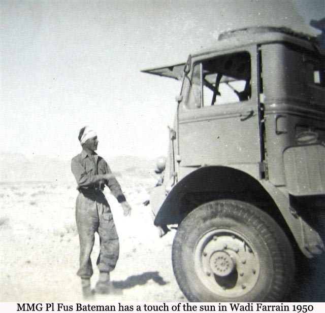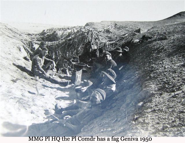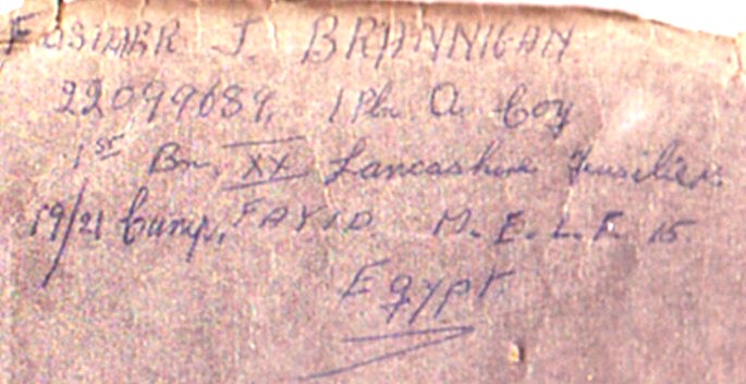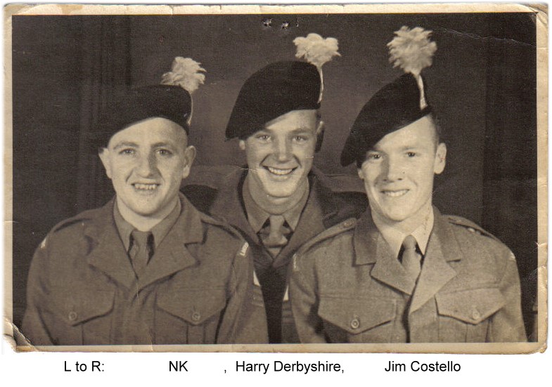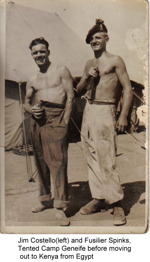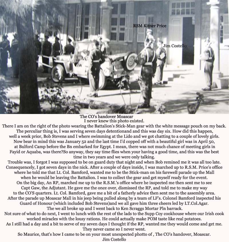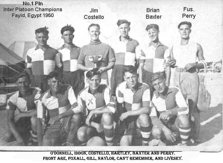 I've been racking my bit of a brain (only took a sec or two) to remember the lads name then I woke up at 2.10 this morning and said "Bloody Baxter". Bev was awake and asked me if I was alright as I had been talking in my sleep. But a bit of info before hand, In 1Pln, I was the L/Cpl and 1 Section leader, My two mates, L/Cpl's Naylor and Hallam, were 2 & 3 Section leaders respectfully. Jack Barlow was our Pln Sgt and Lt Partington was our Pln Officer. Pic 2C I recall the names Lonsdale and Hulme but do not recognise the lads in the pic. Furthermore, Hulme was excused boots and always wore sand shoes and was on pernament light duties, Pic 4A Don't recognise the lad and don't recall any of our lads wearing a bush hat and those socks are a deffo no no That Foliage is deffo not Fayid nor is the bush hat. The next photos Jim talks about are in Jim Costello section Below 2D, Embarking for Egypt, and on arrival straight into Fayid. There are eighteen members of 1 Pln in the main group with no sign off Jim B. 6 A . 1 Pln team, some were also in 2D and others were not. No sign of Jim B. 6B. 'A' Coy team, also no sign of Jim. Anyway down to business. Maybe Jim B, could have joined us in the new draft that came out some months after we first arrived, as his bed space (pic4B ) is in 'A' Coy lines in Fayid, our first posting abroad in 1950. Also the letter (pic 3D ) is addressed to him, in Fayid. I'm inclined to think he was in 2 or 3 Pln because pic 3C shows part of the outside line of 'A" Coy tents. Now A.C,and D, Coy' s each had two lines of tents abreast of each other and usually occupied by 5 or sometimes 6 lads. In our case, the first two tents abreast were for my 1 section, the second two abreast for 2 section and so on right down the line. Each line being 9 tents long then running across the end of the line were the Egyptian traders tents. The barber, soft drinks, fancy goods, tailor and so on. Now pic 8A seems to feature
