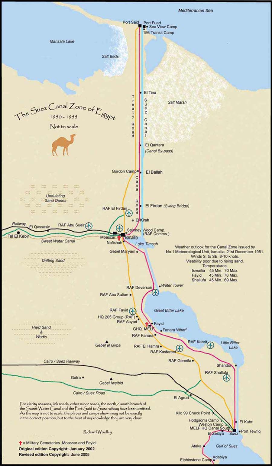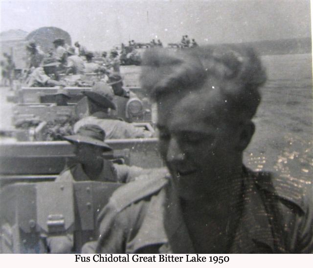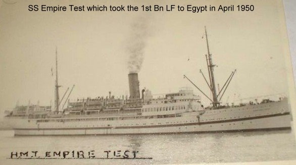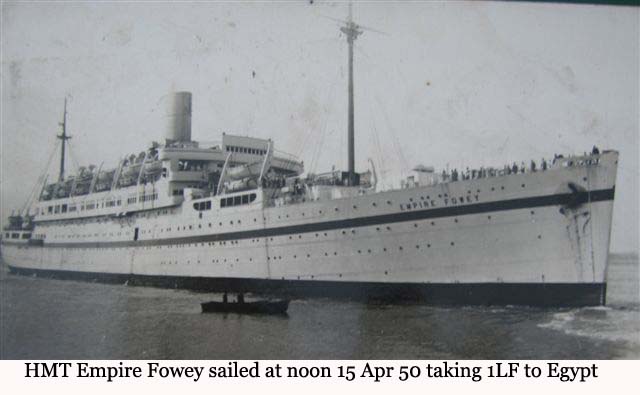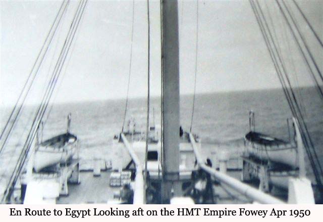 We sailed on HMT Empire Fowey at noon on 15 April 1950. A smashing troop ship. We arrived Port Said about ten days later and then by train to Fanara and marched to Camp 19/21 in Fayid. |