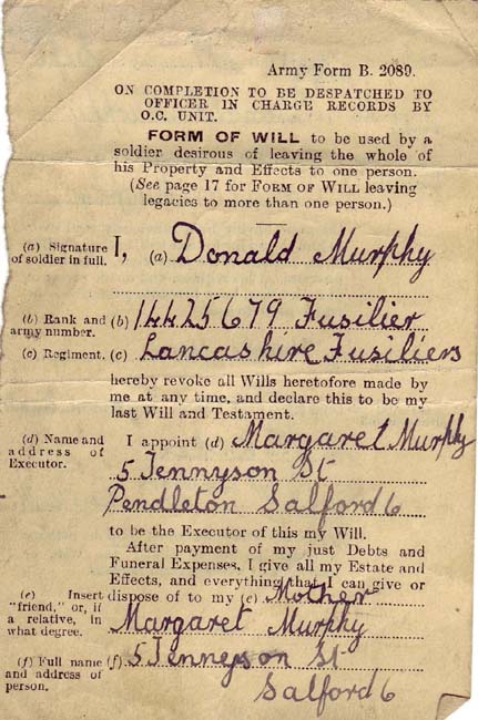 C/Sgt Donald Murphy Some time ago I contacted your site via Joe Eastwood to ask if anyone knew of my late father Donald Murphy and to ask for my fathers name to be included in the L..F.'s at rest "Book". I noticed at the time that Joe Gidmans name was also in the Column. Joe was my fathers best mate and a useful boxer I think he may have represented the Bn. I said at the time that I my mother had a picture of my father and Joe and that his family might like to see it. Also included is one of my mother Anne) and father on their wedding day. After the 2/5th Bn. disbanded my father found his way, via the H.L I. into the Blackwatch this fact nearly led to his undoing because whilst my mum and dad were on honeymoon in Ireland, my mother being Irish and from Cork (Despite his surname this was the first time my dad had been to Ireland) Proudly announced that my father had served in the Black and Tans whilst they were in the local pub my dad told me it was the closest he ever came to spilling a pint. There is alsoa scan of my fathers last will in which her leaves his worldly things to his mother a grim thing to have to do for someone who had turned eighteen two months earlier John Murphy
