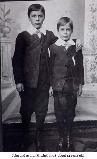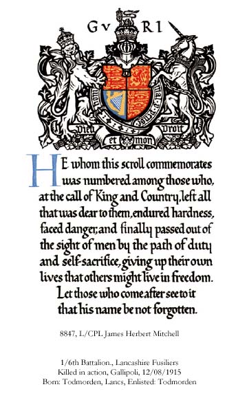 is one of Danny Daniel's Grandfather. The photos shows J.H.Mitchell on the left of the photo,the photo was taken in 1908, he would have been about 13 or 14 years old.The scroll was sent to the family who apparently would never believe he was dead. He would have left Egypt between the dates May 1st and May 6th 1915, going by the date of his death I would presume he was killed at the battle of Krithia. Vineyard grave number G54 Lancashire Landing Cemetary