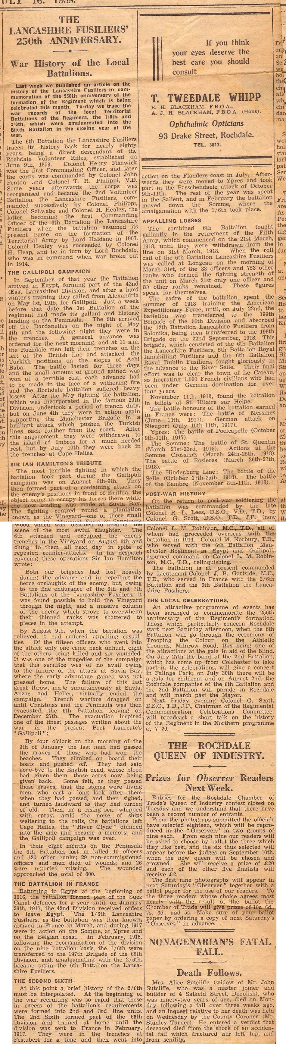 Private John Newton 1/6th Lancashire Fusiliers. Private John Newton of the 1/6th Lancashire Fusiliers, was killed in action at the Dardanelles on December 20th, 1915. He was only 19 years of age and join the colours on May 5th, 1915, being then employed as a piecer at the Malta Mill. He was also a member of the Mills Hill Baptist Church and Sunday School. A comrade writing to the deceased soldier's aunt at Baytree Lane, Middleton Junction, said: "We were very sorry when he got killed. We were together in the firing line, and have been together some weeks. Please accept my sympathy and it be maybe some slight comfort to you to know that he suffered no pain being killed instantaneously by a bullet through the head, and is buried with some of these comrades on the beach at Lancashire Landing, where the 1st Fusiliers made history. Poor lad, if he had lived for six days he would have been saved, for we got relieved off the peninsula on the 26th. He was always cheerful, never complaining, and met his end like a British soldier without a murmur, or a groan." Another famous Territorial from Middleton, also laid