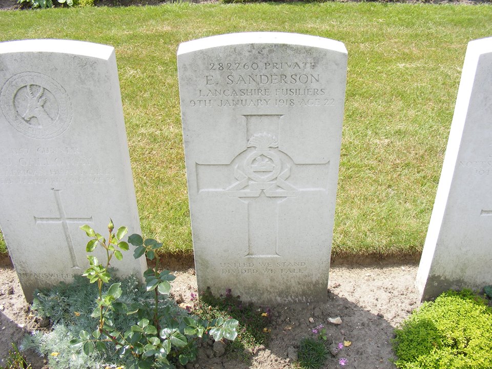 Private Edwin Sanderson 1/7th Lancashire Fusiliers. Private Edwin Sanderson aged 21, of the Lancashire Fusiliers, son of Mr and Mrs A. Sanderson, 9, Reservoir Street, Middleton, died from wounds on January 9th, 1918. He enlisted in November 1915, and had twice previously been wounded with gunshot. He was employed by R. K Lee & Co, and was connected with Holy Trinity Church, Parkfield. The Chaplain wrote to Mrs Sanderson. "You will have heard the sad news of your son's death before you receive this letter, but I am writing to tell you what I know about him. He was brought to this hospital the night before last at about 9 o'clock. He was terribly wounded in the chest and was unconscious. He passed away quietly at 1:15 that night. I went to see him several times but of course he could not speak to me. I saw him for the last time at midnight, and said the prayers for the dying at his bedside. Today I have laid him to rest in our cemetery. I am glad that your boy was spared suffering. May God bless and comfort you and give you strength to bear your cross as bravely as he bore his. Private Sanderson is laid to rest at Chocques Military Cemetery, France.