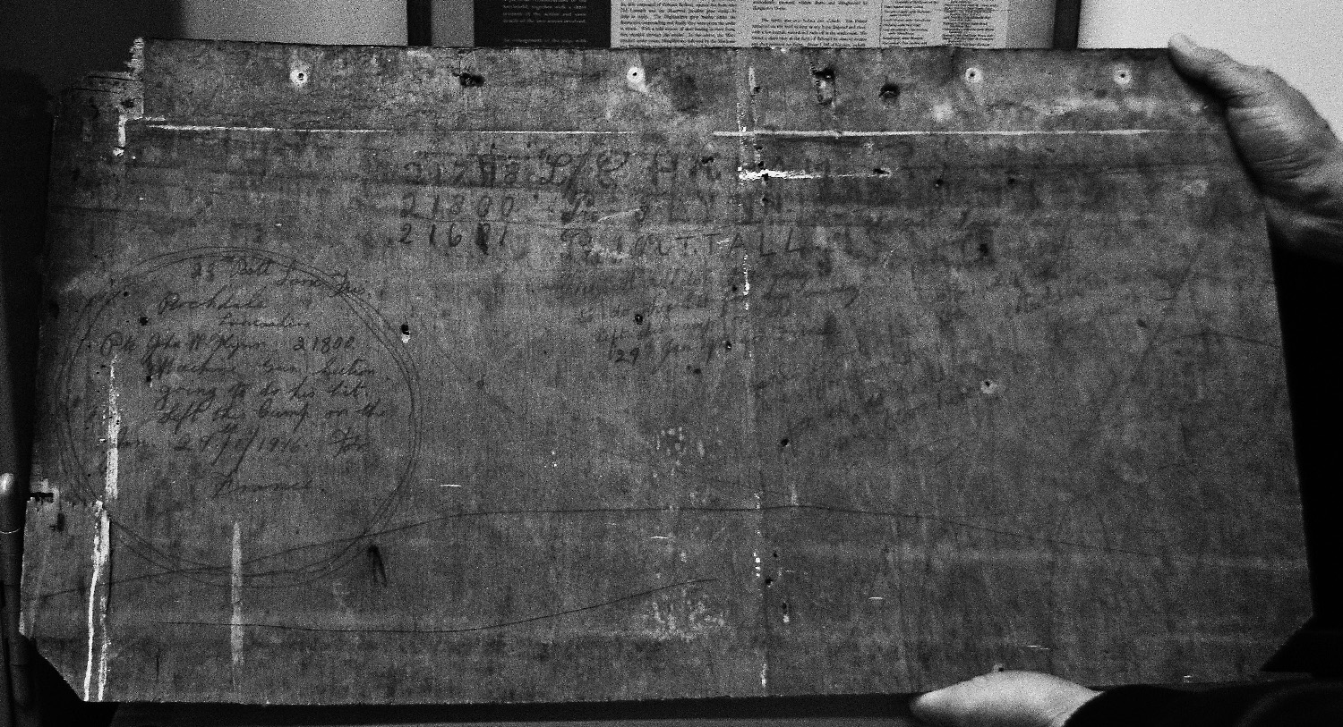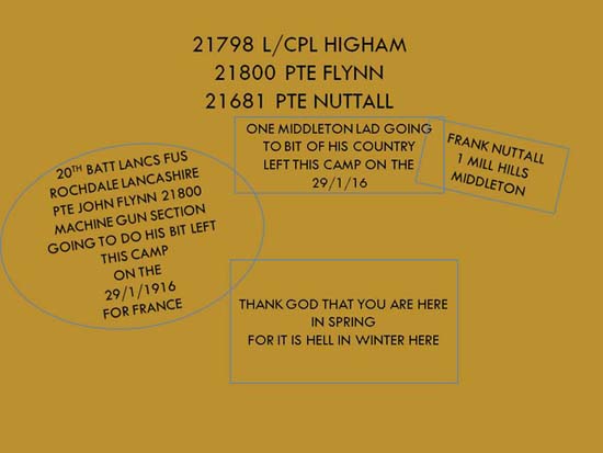 The Fusiliers Museum in Bury is trying to find the Families of 3 Lancashire Fusiliers from the 20th Battalion (4th Salford Pals) Whilst renovating a Hampshire building from the 1920's a couple of years ago, farmer's wife Sharlene Mears came across an old piece of plywood that had obviously come from a barracks or something similar The 20th Battalion Lancashire Fusiliers (4th Salford Pals) had been at Park House Camp on Salisbury plain all the winter of 1915, from August until the date of their leaving on 29th January for Southampton when the 3 left their messages. Within 12 days of writing their farewells they were inspected by Lord Kitchener in Racquinghem France, and then into the trenches on the 27th February. What I find remarkable is that these 3 lads all made it through the next 3 years of the most horrible war imaginable, and they all came home! There were messages written in pencil from 3 Lancashire Fusiliers who were just about to go over to France, dated 29/1/16. The 20th Battalion of the Lancashire (4th Salford Pals) Fusiliers is given, and one of them mentions the Machine Gun Section. Sharlene contacted the www.lancs-fusiliers.co.uk Web Site and told Editor Capt Joe Eastwood the story and asked if we would like the piece of plywood she sent it to us and we have passed it on the XXth Lancashire and Royal Regiment of Fusiliers Museum The names on the Plywood board are