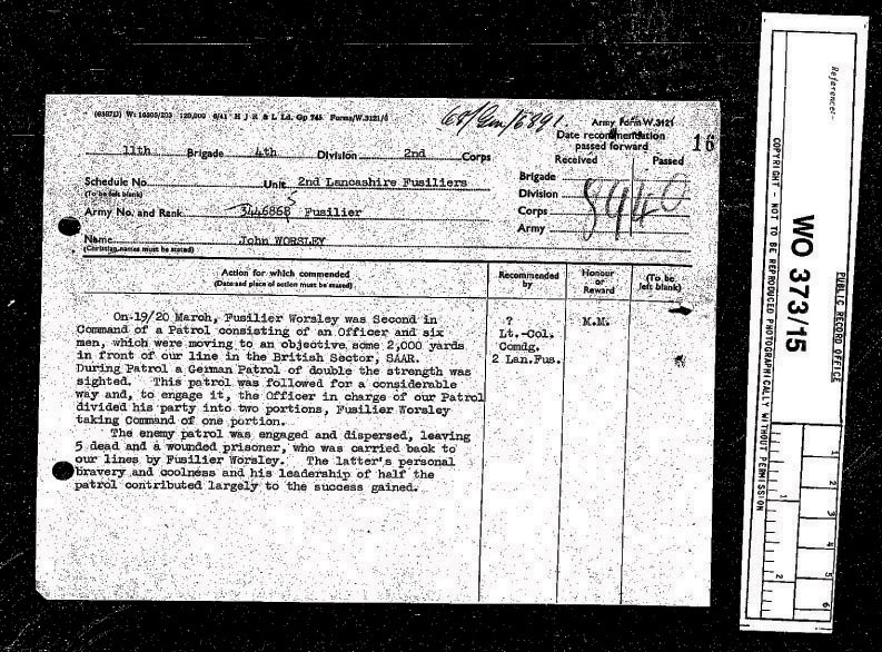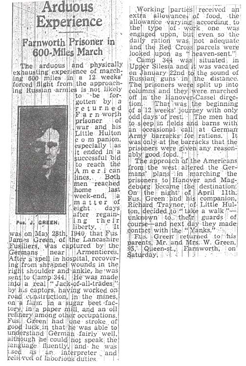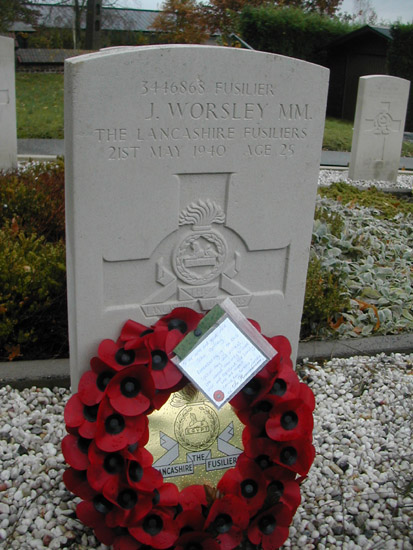 On the 3rd September 1939 the 2nd Bn The XXth The Lancashire Fusiliers received orders to mobilize as part of 11 Infantry Brigade which was in 4 Division, 2 Corp of the (BEF) British Expedition Force. The Bn moved from Colchester to Aldershot ,having sent all it's vehicles to Newport Monmouthshire for shipment overseas. The Bn moved to Southampton on the 1st October 1939. On the 2nd October 1939 the Bn embarked on the SS Duke of York and sailed for Cherbourg in France. They then went by train to Graz where they stayed for 7 days before moving to Meurchin and then marching 2 miles into Wingles, led by the Drums Platoon playing. The Bn stayed in Wingles for approx 3 weeks and then moved to Tourcoing on the 30th October 1939. They were involved in defence digging and training until the night of the 19th March 1940 when they had their first engagement with the enemy. A fighting patrol of the 2nd LFs met a similar patrol of Germans and killed five and captured one of the enemy. Captain J F M Hudson was awarded the MC for this action, Fusilier Worsley was awarded the MM. These were the first Army awards for gallantry to be won in WW2. On the 14th May 1940 the 2nd Bn moved into Brussels Belgium by motor transport. Sent in by Barbara Manton |