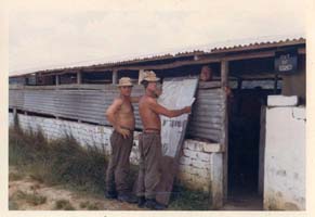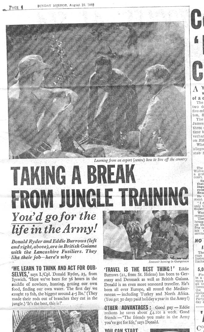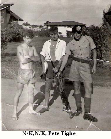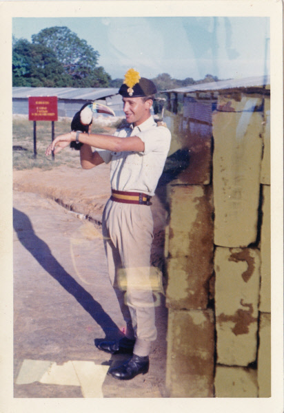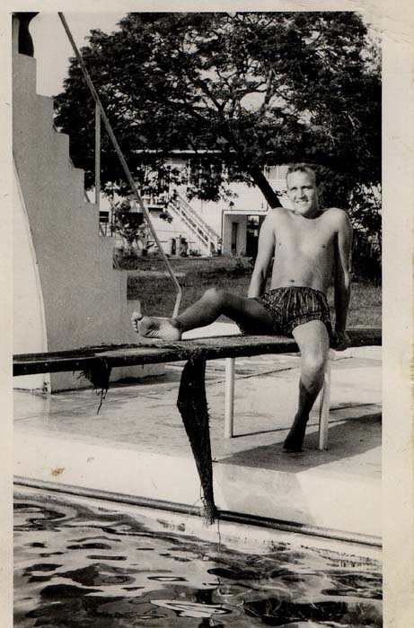 Ginger Hodnutt had a young alligator in BG. It attacked a pet otter which someone else had, but I can't remember who. The same otter attacked Joe's Nelson the parrot, and that's why it finished up with only one eye, and a broken leg. All that after having its wings clipped to stop it flying away! During my time in BG, I had an Armadillo which crapped all over the place, so I got rid of it, then I had a three toed sloth, which I used to stick on a tree while working. It was too slow to escape. I can't remember what happened to that, I think one of the locals ate it! The cat of mad Campbell's was a young ,Oceot (small tiger) he threw it in the swimming pool in Georgetown, and it took the locals about three seconds to get out!! |