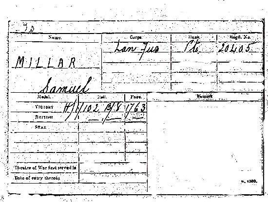 Sam was born in Liverpool on 26 October 1888. He enlisted with the Lancashire Fusiliers and became Private Millar - Number 20405.