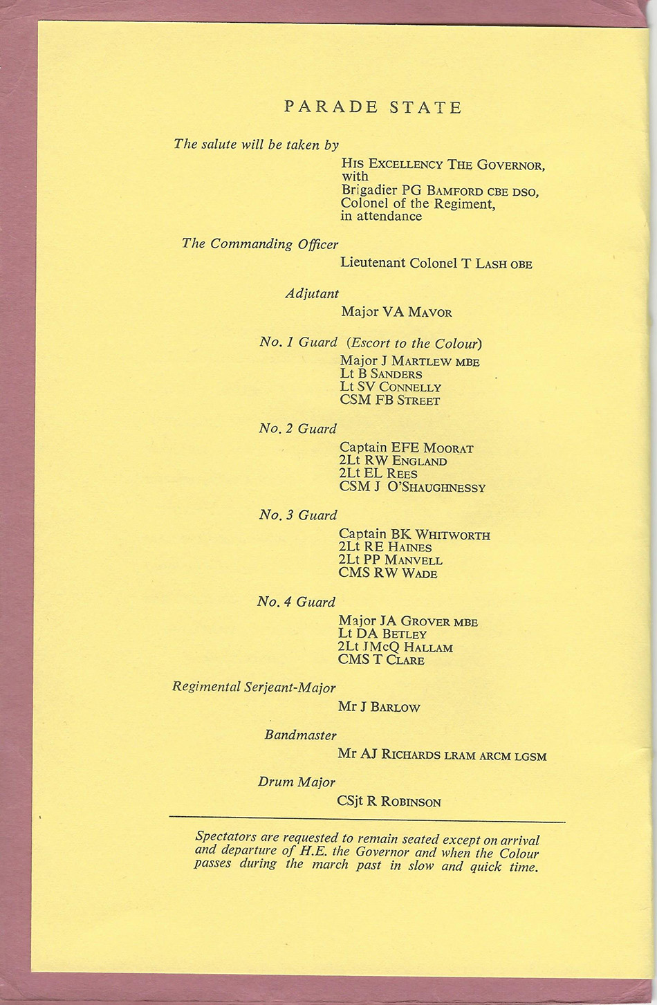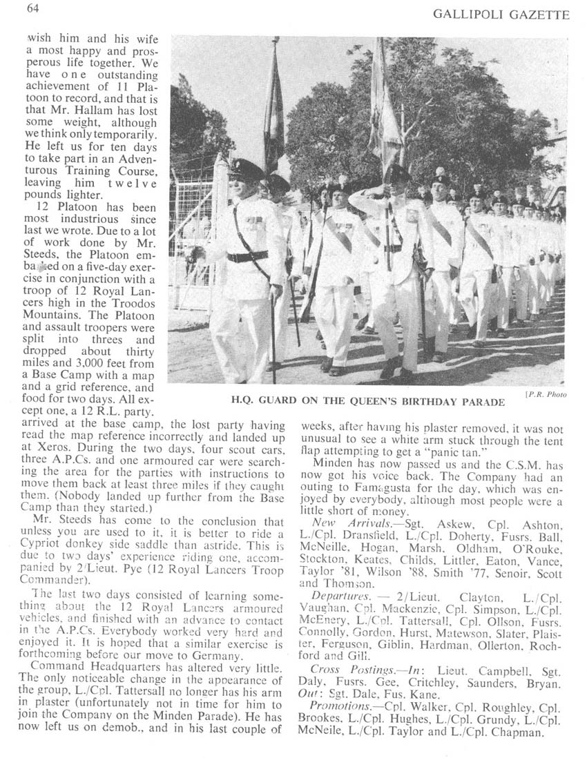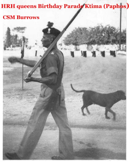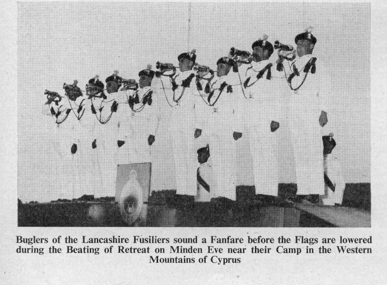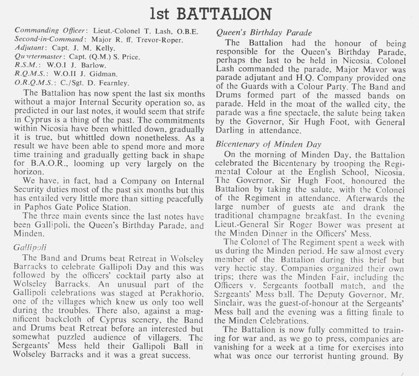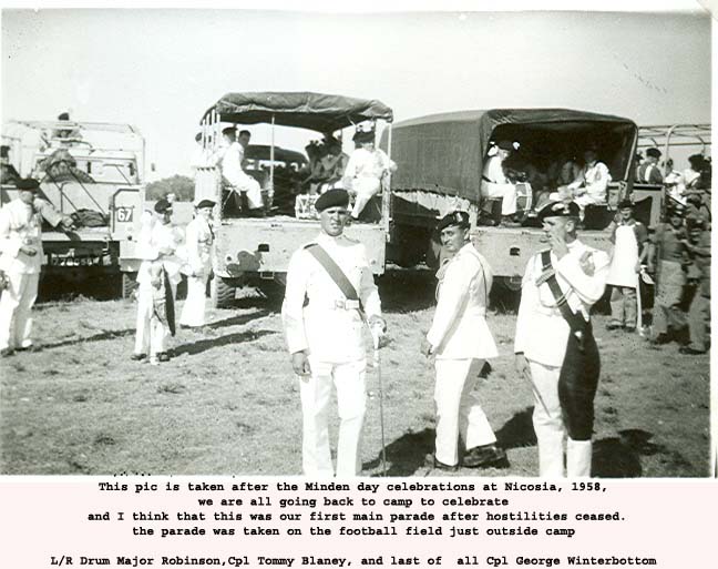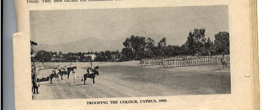The mystery is solved by seeing in the write up that the 1st Bn provided most(not all) of the Queens Birthday Parade held at "The Moat" of the walled City of Nicosia Cyprus. The Bn provided one guard(HQ Coy). On the Bicenenary of Minden the Bn trooped the Colour at the English School Nicosia(probably on the sports field ) . The Governer Sir Hugh Foot took the salute on both parades. End of Mystery. |