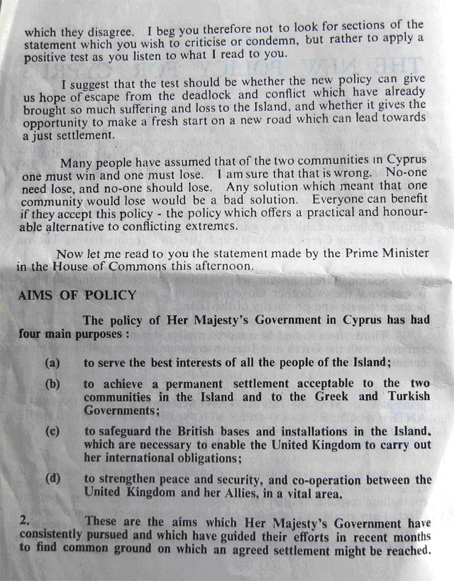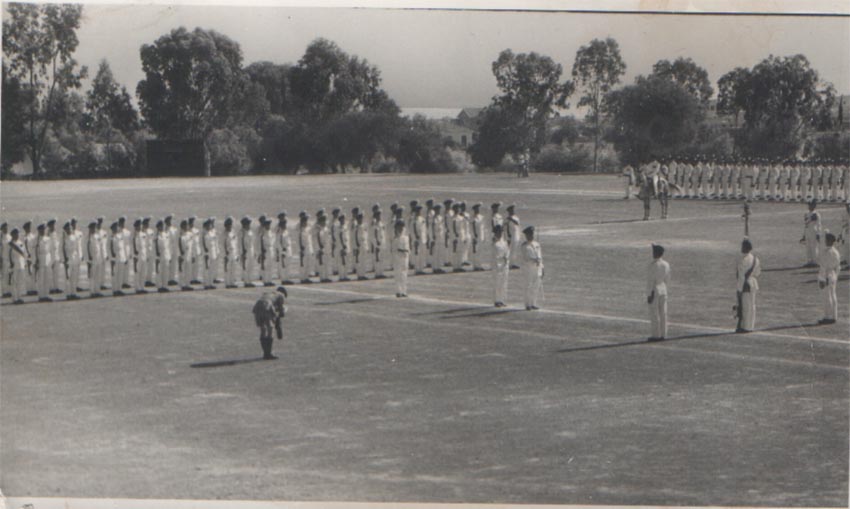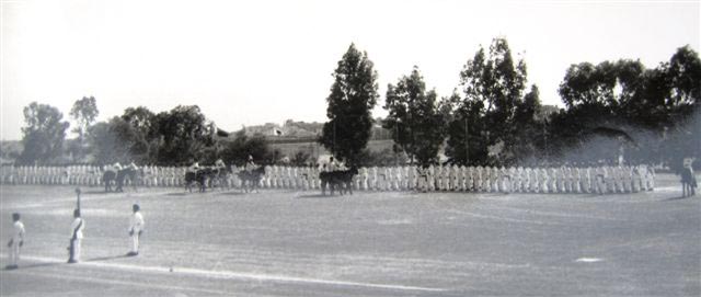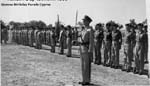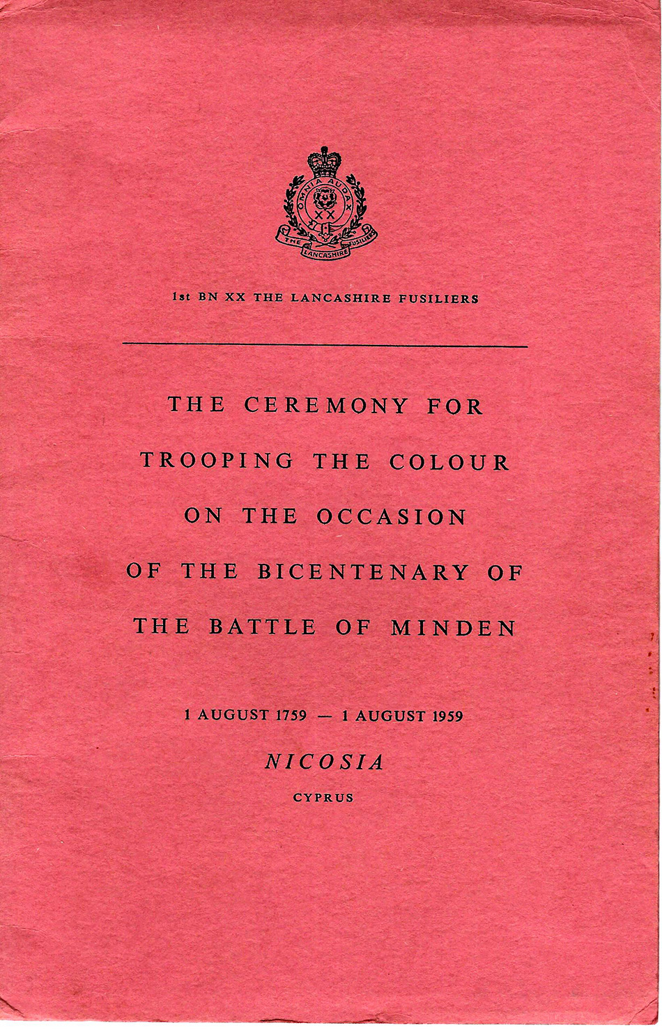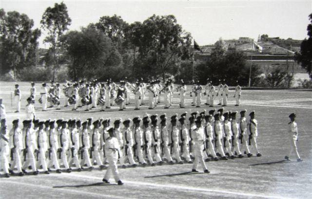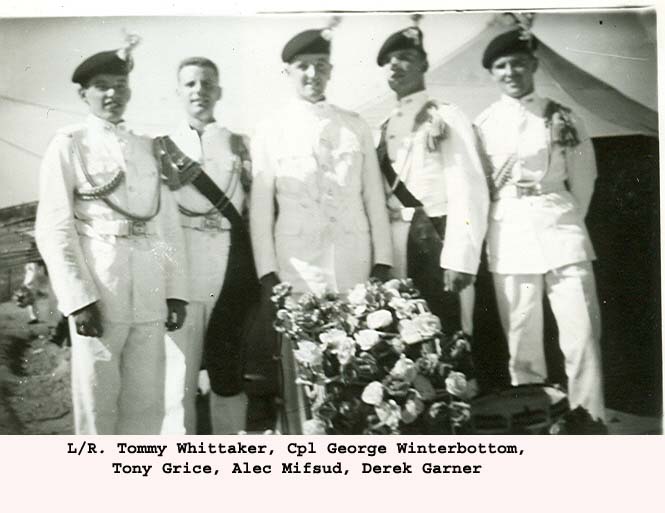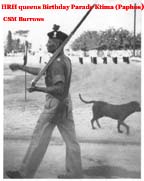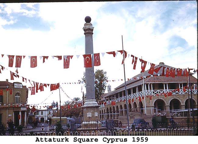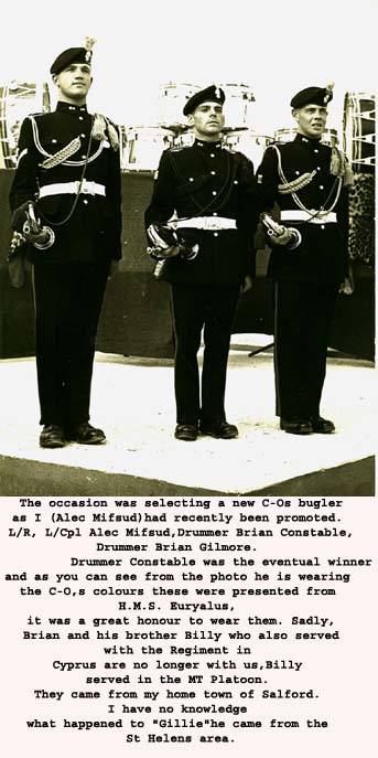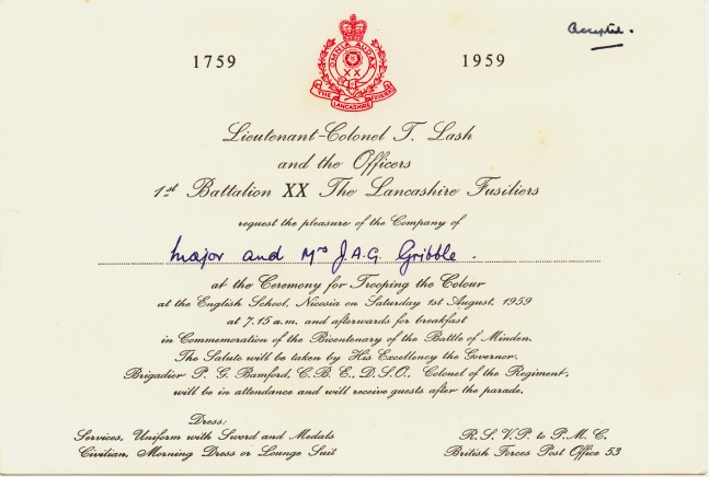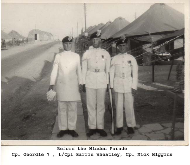The mystery is solved by seeing in the write up that the 1st Bn provided most(not all) of the Queens Birthday Parade held at "The Moat" of the walled City of Nicosia Cyprus. The Bn provided one guard(HQ Coy). On the Bicenenary of Minden the Bn trooped the Colour at the English School Nicosia(probably on the sports field ) . The Governer Sir Hugh Foot took the salute on both parades. End of Mystery. |