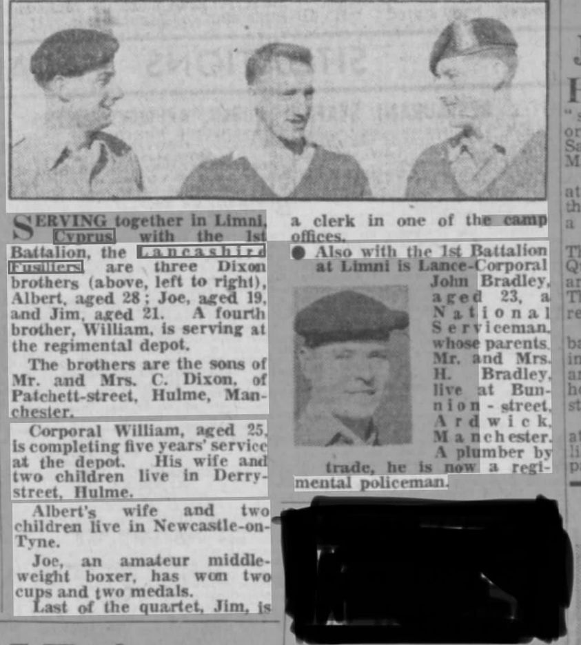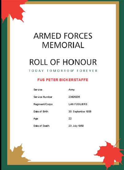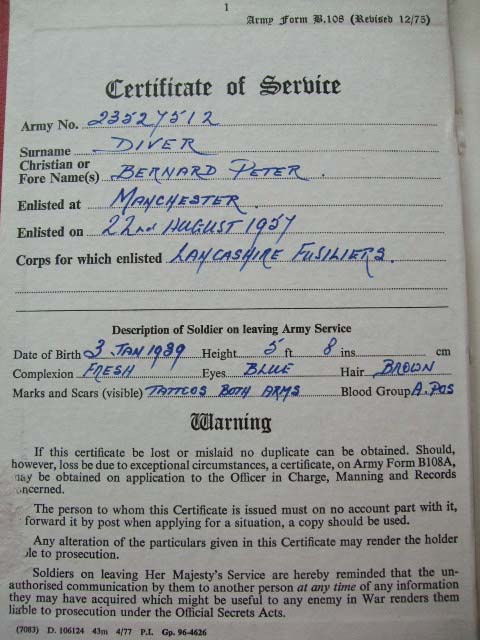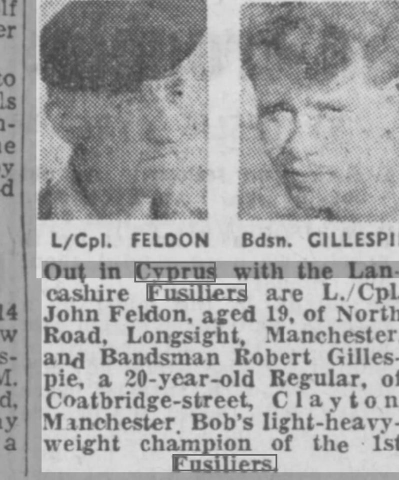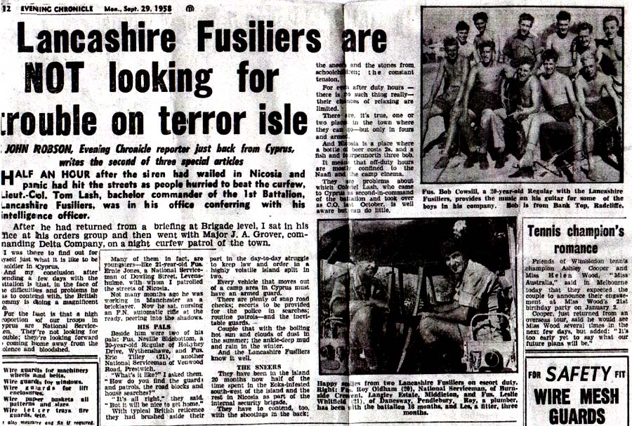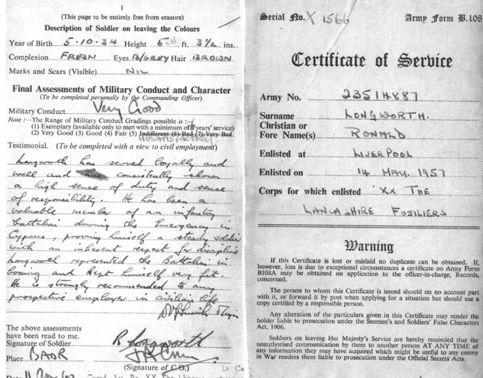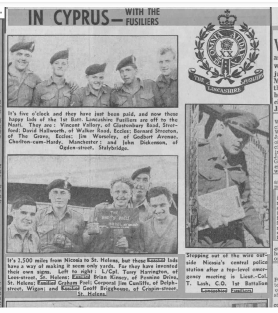 Have been reading through the LF website with great interest, what an excellent resource and fitting 'home' you have created for Fusiliers past and present. I take my at off to you all. Anyway, the point in me writing is to say that I was researching a Lancashire Fusilier medal (Cyprus) which is new to my collection. I haven't found him, but enjoyed looking! Perhaps you would like his details to add to your nominal roll: 23428616 Fusilier W. Booth, Lancashire Fusiliers. Given his Regimental number, I believe he would have enlisted around the last quarter of 1957. Owen Dobson ![]() |