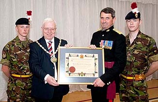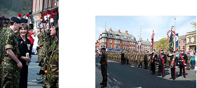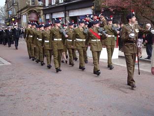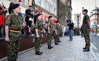 by 5 RRF Padre Capt Peter Turnbull. The Parade was blessed with unseasonable 'hot and sunny' weather which helped bring out a crowd of several thousand who lined the whole route and cheered the marching troops on. The parade was lead by 5 RRF with a Colour Party and Regimental Band, but there was also a full guard from 2RRF and a combined guard of 1RRF and recruits from ITC Catterick. The route was lined by cadets from Northumberland ACF. The parade halted on Newgate Street opposite a saluting dais and was inspected by the Leader of the County Council, the Colonel of the Regiment, the Duke and Duchess of Northumberland, and the Mayor of Morpeth.