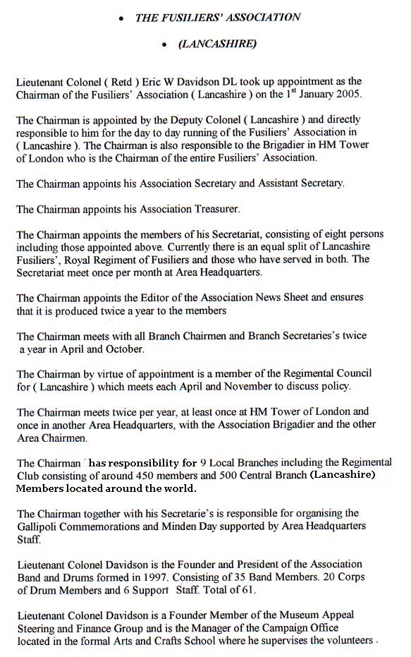 Now that my tenure of appointment as Chairman of the Association in Lancashire has almost terminated. I wish to take this opportunity to express my personal thanks to my team at Headquarters namely Major Jennifer Hindshaw, Stehpen Fitt, John Scotson and Linsay Walsh for their support. Also the members of the Secretariat not listed above namely Don Kilgallon and Alan Noble. Ronnie Owen for his unstinting work on the recording of Association Members. Dennis Laverick for his professionalism in setting up the Association Web Site. http://www.fusiliers-association-lancs.co.uk I have thoroughly enjoyed my time as Chairman and derived much pleasure from the office and occasionaly the sadness it has brought. However time marches on as we all do and I wish my successor Captain John ( Ginger ) O Grady every happiness in the post. I thank all the Members of our local branches together with those in Central Branch for their support during my time as Chairman and offer them good wishes for the future. I am looking forward to the new challenge as Director of Operations and a Trustee. Good Luck and God Bless You All. Colonel Eric |