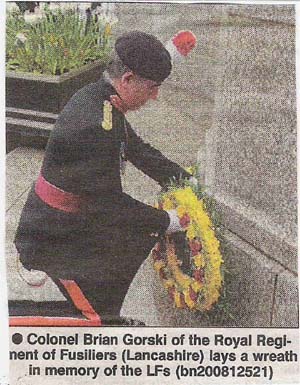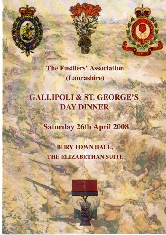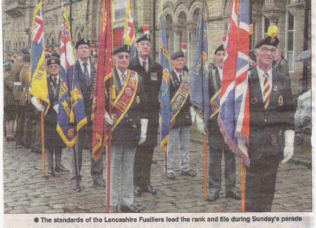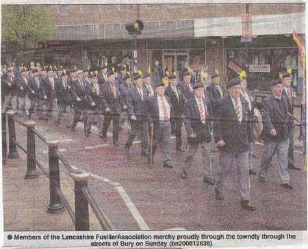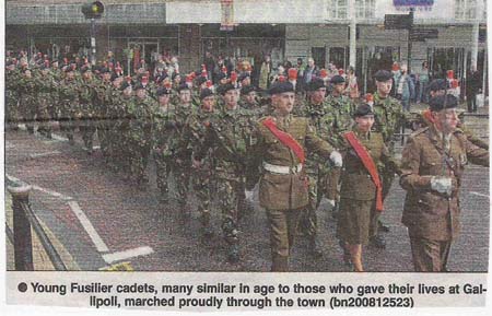 From the Bury Times on 1st May 2008 The 91st anniversary of the Lancashire Landings at Gallipoli was commemorated on Sunday as the young and not so young, the great and the good, turned out to mark the borough's regiments' greatest achievements. Led by the Fusilier Association Band and Corps of Drums, the parade of military cadets and Fusilier veterans, and serving Territorial Army soldiers preparing to go to Iraq from May, stood in silence as they reflected on an infamous First World War campaign that cost thousands of local lives but gave the Fusiliers eternal glory. Wreaths were laid at the war memorial in honour of