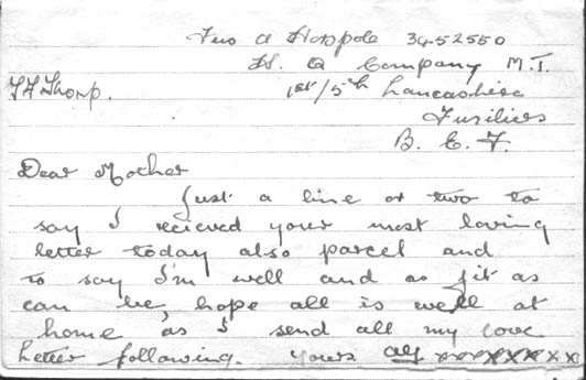 Hello, I am the neice of Alfred Horspole who served with the Lancashire Fusiliers during the second world war. He survived the war, but died in his late 30s. A couple of years ago a gentleman who served with him during the war tried to contact the family via an elderly relative, and unfortunately she lacked the foresight to take his name, address or telephone number. He had been trying to get in touch with members of the family to ask if someone might want to attend the annual reunions on my uncle's behalf. I have tried for some time to trace which regiment he was with (completely without success) and it is literally this weekend that I have been sent a postcard with details of his regiment, and his number. My mother is his only surviving sibling, and the whole family feel a sense of urgency to try and make contact with whoever it was who unsuccessfully tried to get in touch with us. We all feel that time is marching on, and as the gentleman must now be in his late 70s - we would like in some way to be able to let him know that we would like to contact him and perhaps be able to fulfil his request. My uncle was a tank driver, and I believe he served in other regiments than the Lancashire Fusiliers at a later date. I know he served at Dunkirk, and also in the desert campaign. His number was 3452550 He gave the title and address (on the postcard) as: Fus. A Horspole 3452550 H. Q. Company M.T. 1st/5th Lancashire Fusiliers B E F a name to the side of this address is T A Thorp The card indicates that it has been sent from "Somewhere in Bonny France" I would be so very grateful if you can help in any way. I have written to so many people during the course of the past couple of years, all without success and am so very hopeful that you will be able to help now that I have at least a little information. Sincerely yours Jeannie Hardacre |